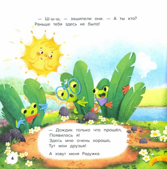 Давным-давно радуга Радужка выглядела как маленькая белая дуга. На ней катались, как на горке, лягушки, грелись ужи и прыгали бабочки. Ух как всем было весело, только не Радужке.