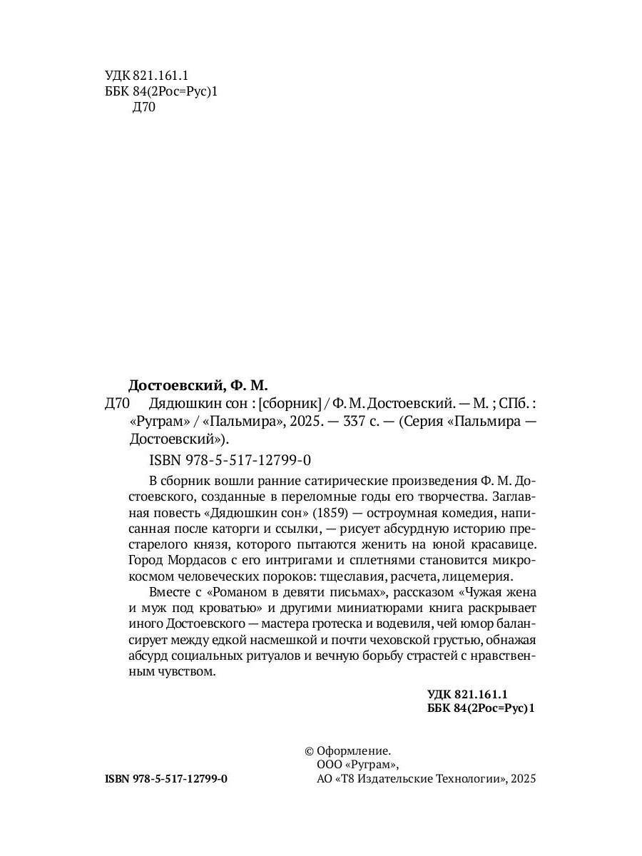 Handling time: 19 days Автор: Достоевский Федор, «Дядюшкин сон»: В сборник вошли ранние сатирические произведения Ф. М. Достоевского, созданные в переломные годы его творчества. Заглавная повесть «Дядюшкин сон» (1859) — остроумная комедия, написанная после каторги и ссылки, — рисует абсурдную историю престарелого князя, которого пытаются женить на юной красавице. Город Мордасов с его интригами и сплетнями становится микрокосмом человеческих пороков: тщеславия, расчета, лицемерия. Вместе с «Романом в девяти письмах», рассказом «Чужая жена и муж под кроватью» и другими миниатюрами книга раскрывает иного Достоевского — мастера гротеска и водевиля, чей юмор балансирует между едкой насмешкой и почти чеховской грустью, обнажая абсурд социальных ритуалов и вечную борьбу страстей с нравственным чувством.