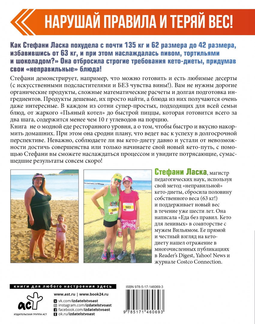 Handling time: 14 days НАРУШАЙ ПРАВИЛА И ТЕРЯЙ ВЕС!Как Стефани Ласка похудела с почти 135 кг и 62 размера до 42 размера, избавившись от 63 кг, и при этом наслаждалась пивом, тортильями и шоколадом?» Она отбросила строгие требования кето-диеты, придумав свои «неправильные» блюда!Стефани демонстрирует, например, что можно готовить и есть любимые десерты (с искусственными подсластителями и БЕЗ чувства вины!). Вам не нужны дорогие органические продукты, сложные математические расчеты и долгая подготовка ингредиентов. Продукты дешевые, их просто найти, а блюда из них получаются очень даже интересные. В каждом из сотни супер-простых, подходящих для всей семьи блюд, от жаркого «Пьяный котел» до быстрой пиццы, которая готовится всего за два шага, содержится менее чем 10 г углеводов на порцию.Книга не о модной еде ресторанного уровня, а о том, чтобы быстро и вкусно накормить домашних.