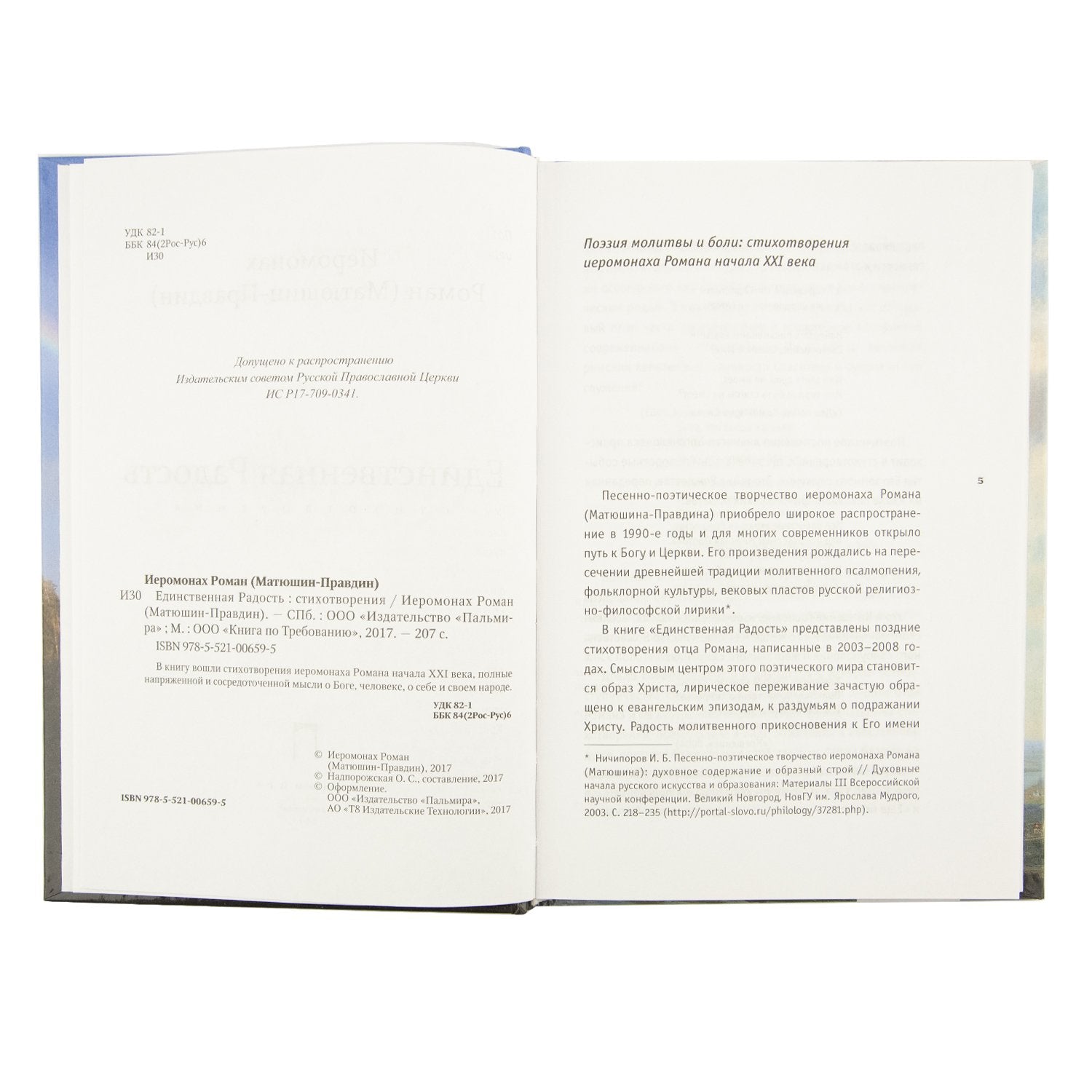 В книге «Единственная радость» собраны стихотворения иеромонаха Романа, написанные в начале XXI века. Смысловой центр его поэтического мира – это образ Христа, по сей день нетрадиционного человеческого рода, евангельская история, находящаяся вне времени и повторяющаяся сегодня. Безумию нашего мира, забывшего Бога, автор противопоставляет Радости уединенного монашеского жития и молитвенного прикосновения ко Христу. Поздние стихотворения иеромонаха Романа показаны не так хорошо, как его ранние песнопения, но заслуживают не меньшего внимания. Это плод многолетних духовных и литературных трудов, трагическая поэзия переживаний и комплексной мысли о Боге, человеке, о себе и своем народе. Допущено к распространению Издательского совета Русской Православной Церкви.