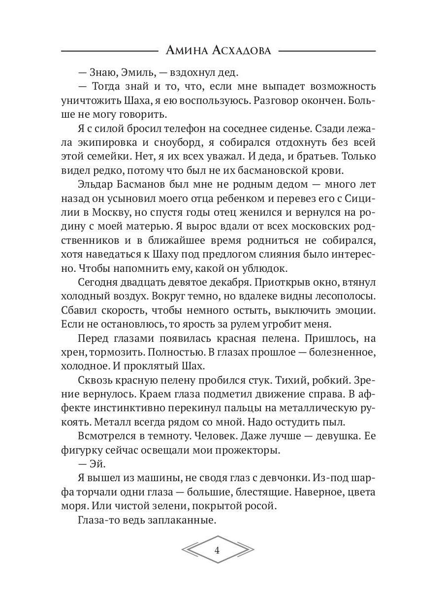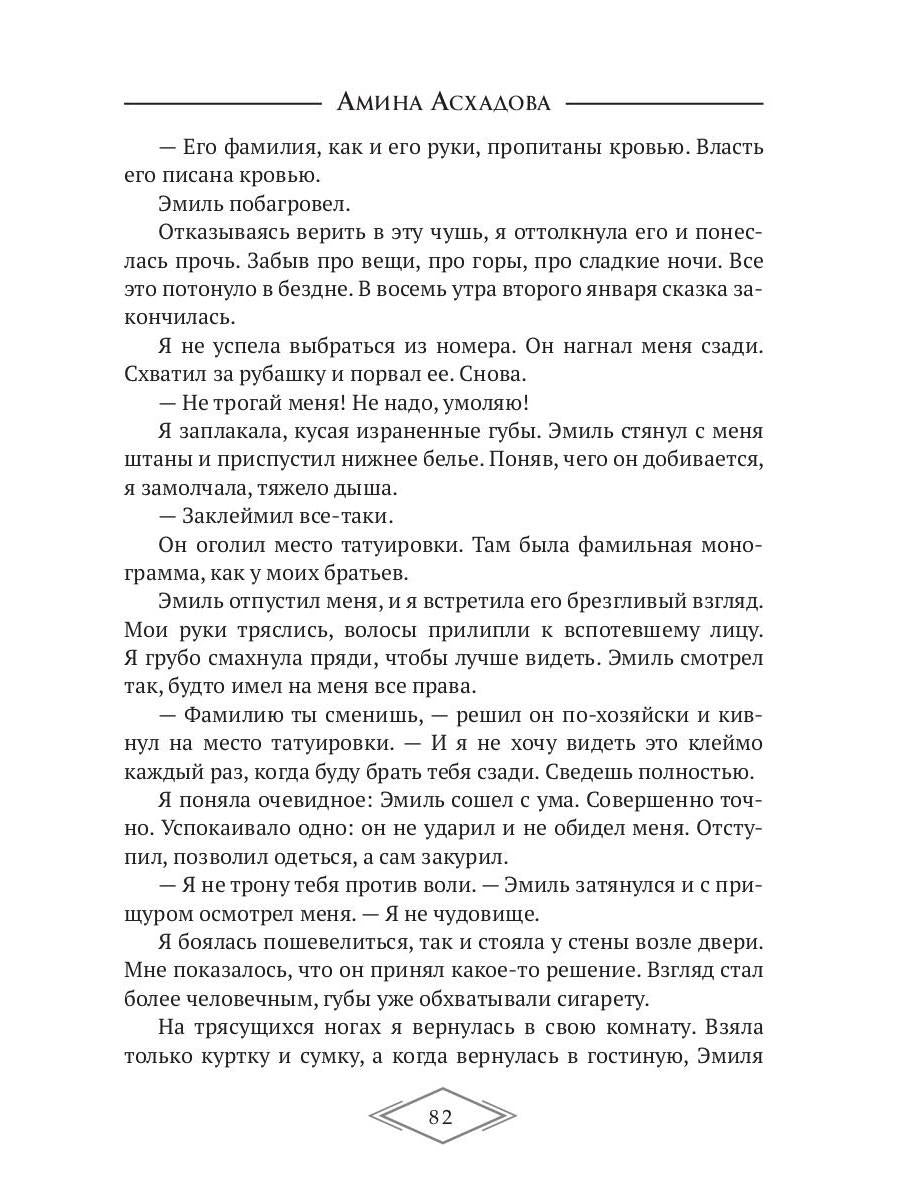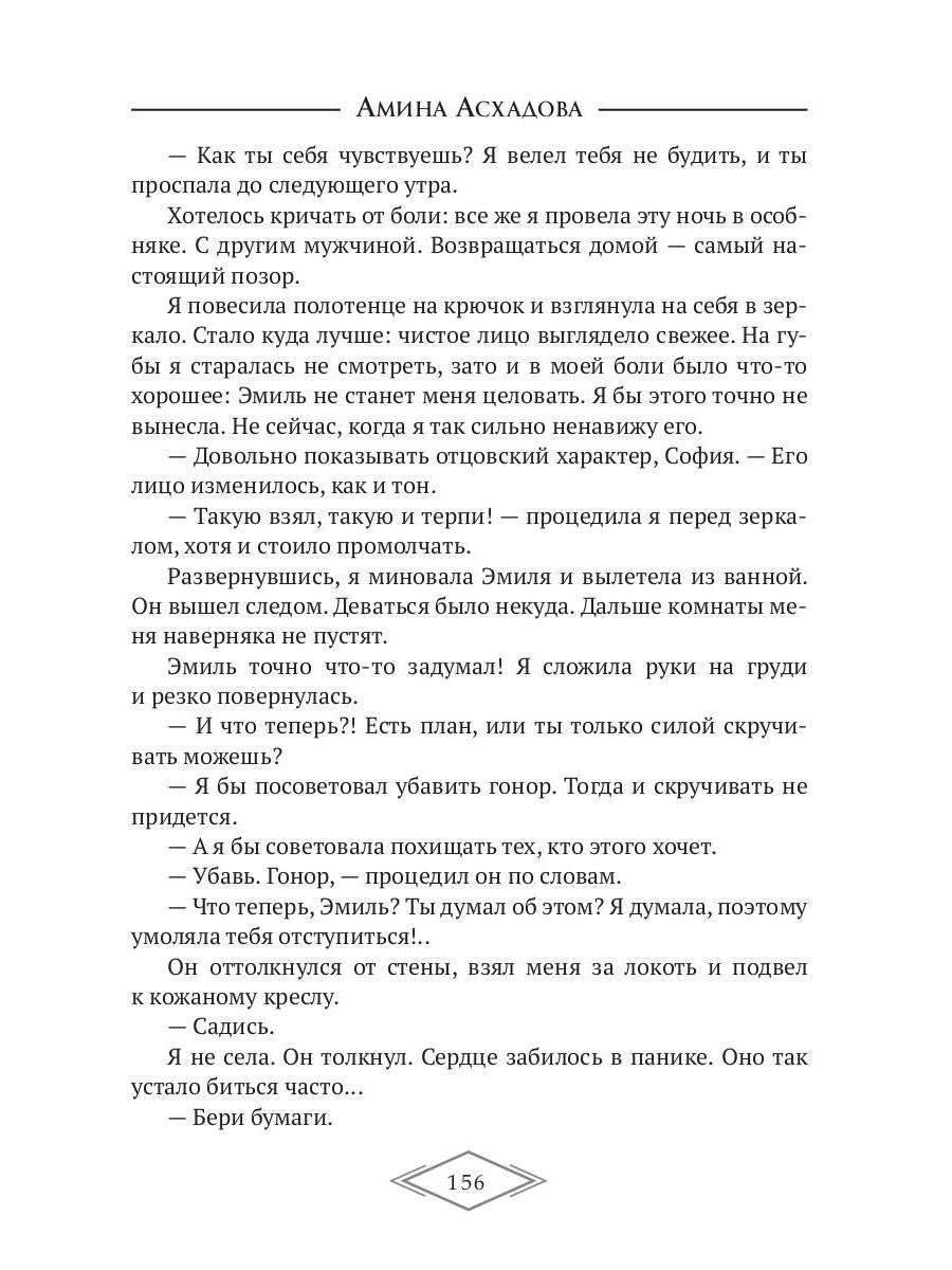 Handling time: 19 days Автор: Асхадова Амина, «Ее нельзя»: - Ты с меня весь вечер глаз не сводишь, словно я тебе принадлежу! Я вспомнил Руслана, ее жениха, и меня накрыло. А кому ты принадлежишь, София, как не мне? Ты так ничего и не поняла? Я сделал еще шаг и вжал ее в дверь, за которой находились ее братья и отец. Бежать некуда. - Спустись с небес на землю. Я - единственная дочь Шаха, и если ты меня тронешь... Я крепче стиснул челюсти. И откуда столько смелости? - То отцу все расскажешь? Заодно пусть узнает, с кем спала его дочь. Сквозь макияж проявился румянец. Девочка закипела, но испугалась. - Чего ты добиваешься?! - Тебя. Себе. Душой и телом. Без запретов. Методы неважны.