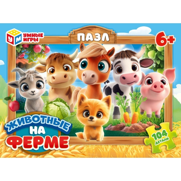 Животные на ферме. Пазлы классические. 104 детали. 190х141х35 мм. Умные игры в кор.24шт