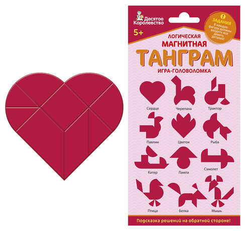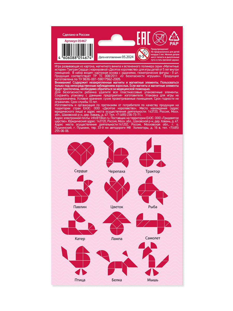 Игра магнитная головоломка "ТАНГРАМ" сердце (европодвес)Состав игры:магнитные детали – 9 шт. (размер сердца 10,5х11,5 см), задание - 12 шт. Материалы: Картон, полимерный материал. Для детей старше 5 лет.