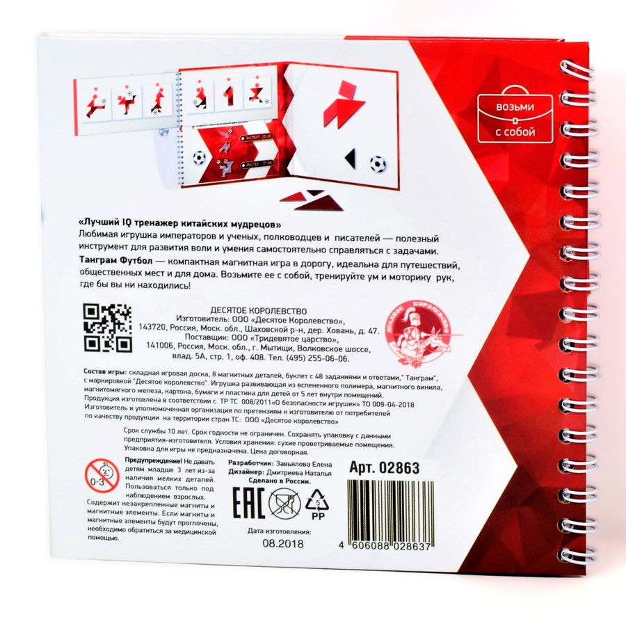Handling time: 14 days Конструктор чемпионов IQ магнитная головоломка рекомендуется для детей начиная с 5 летнего возраста.Обучающая портативная игра логическая магнитная головоломка «Футбол» с 4 уровнями сложности - прекрасный инструмент для формирования математического и художественного восприятия, пространственного мышления, развития воображения и комбинаторных способностей. Цель игры – сложить все 7 плоских фигур и мяч таким образом, чтобы получилось изображение с картинками на буклете. Фигуры не должны накладываться друг на друга.Как играть1. Откройте буклет на странице с желаемым уровнем сложности.2. Выберите картинку.3. Составьте из 7 плоских фигур и мяча силуэтную форму футболистов.4. Существует только 1 решение к каждому заданию.Состав игры:- складная игровая доска-буклет – 1 шт;- магнитные детали разной формы – 9 шт;- 48 заданий и ответов в доске-буклете.Не давать детям младше 5 лет из-за наличия мелких деталей. Пользоваться под наблюдением взрослых.Логическая магнитная головоломка «Футбол», как и многие другие игры серии «Магнитные мозаики-конструкторы» всегда можно купить в интернет-магазине производителя «Десятое королевство» по доступной цене с доставкой по России.