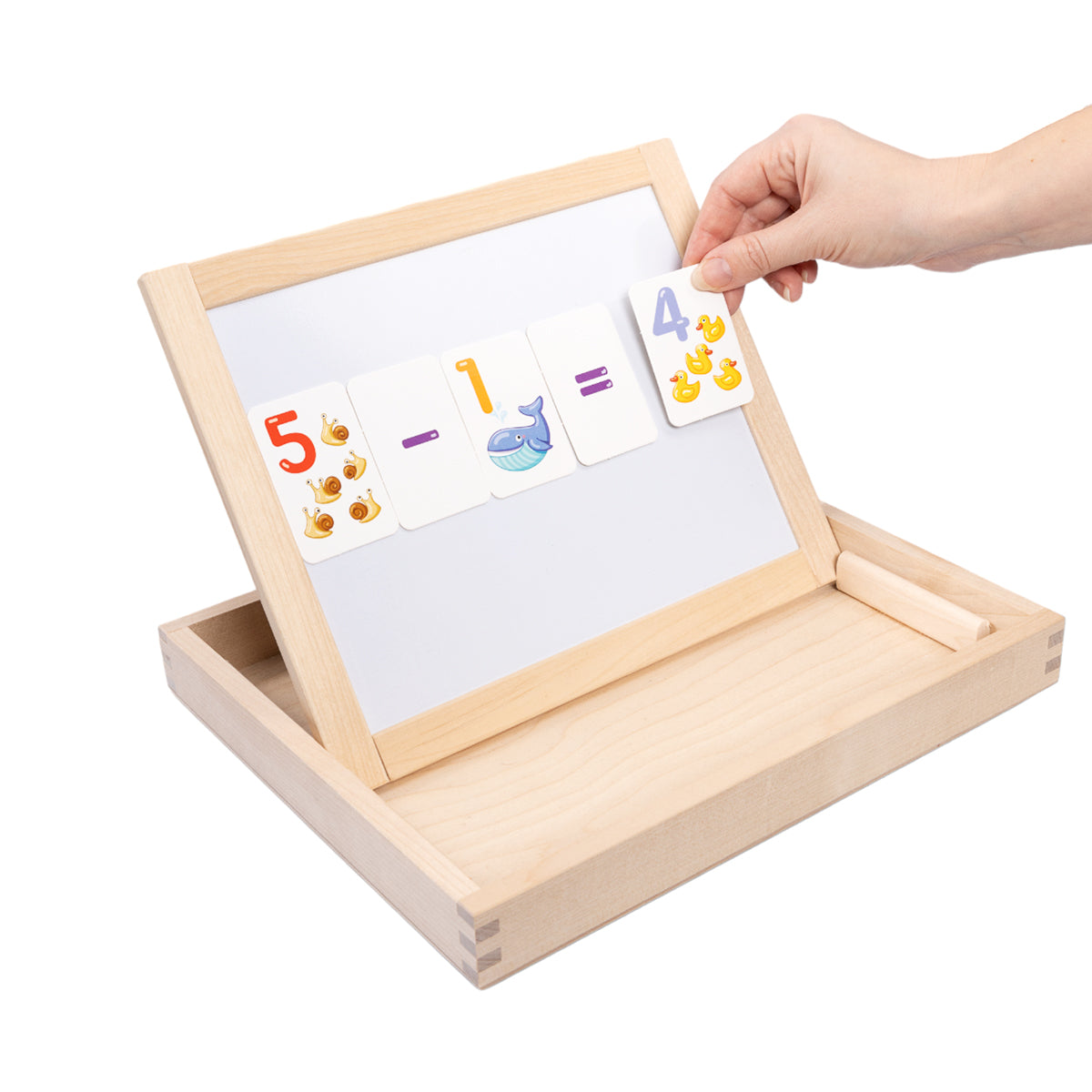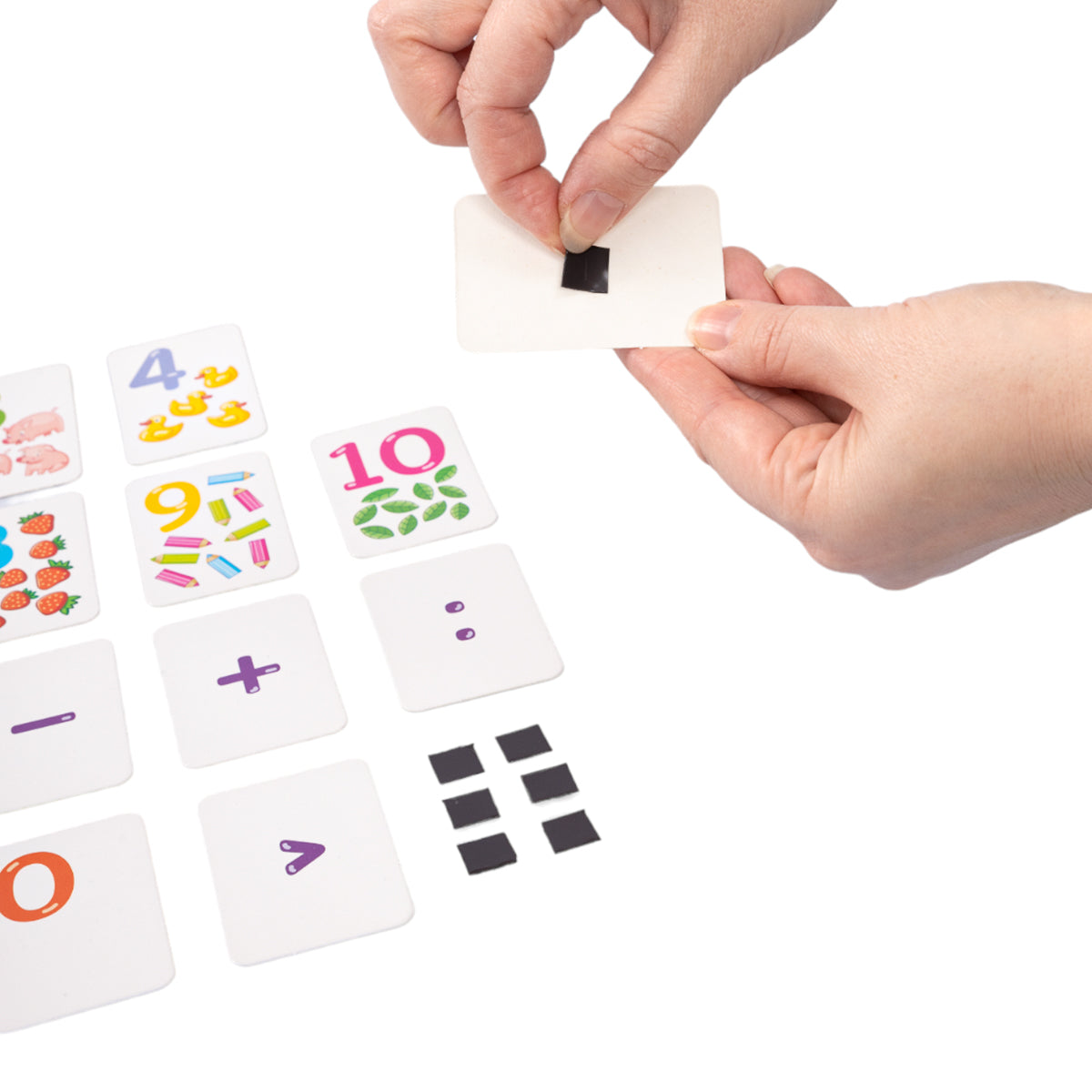 Магнитная игра «Я считаю» 54 элемента. Состав игры: карточки с цифрами и математическими знаками – 54 шт. (4,5 х 6,7 см), самоклеющиеся магниты – 54 шт. Возраст: от 3 лет. Материал: картон, магнитный винил. Игра развивает мелкую моторику рук и логику, учит простейшим арифметическим действиям (сложение, вычитание, деление и умножение), а также сравнивает числа.