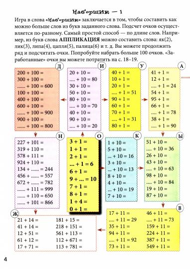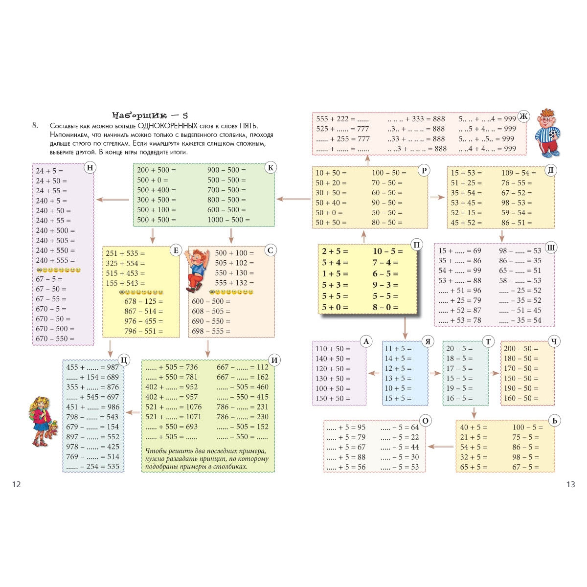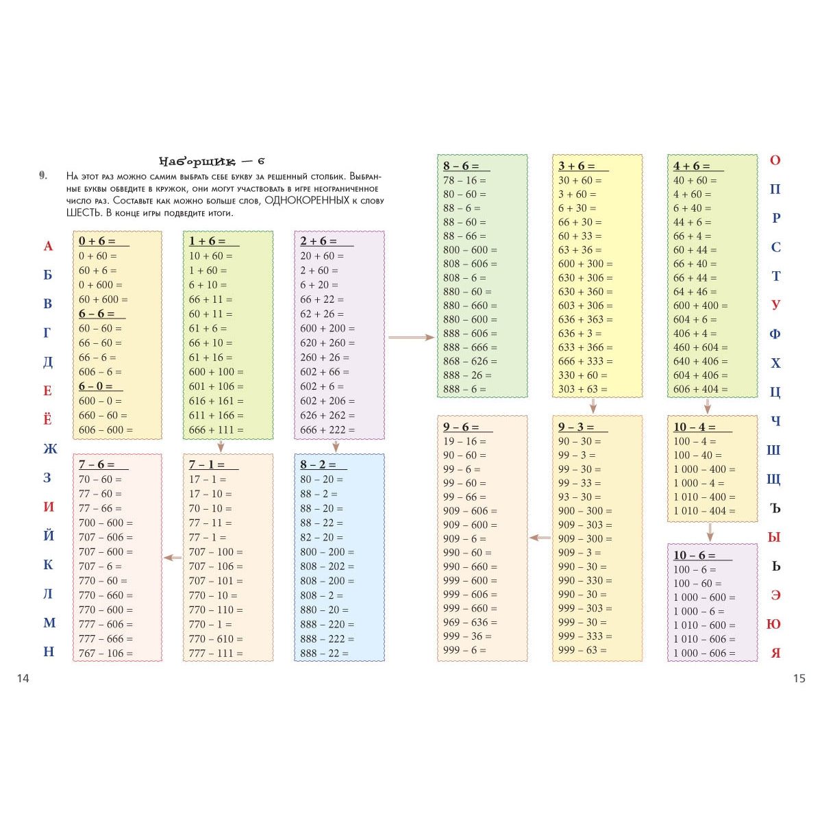 Всем известна словесная игра «Наборщик», в которой надо составить как можно больше слов из одного длинного слова? Наборщик — набор, борщ, рак, бар, бор«А при чем здесь устный счет?» — спросите вы.Мы по аналогии придумали игру «Математический наборщик», которая сочетает в себе и лингвистику, и устный счет. Суть игры проста: решив столбик примеров, участник получает в награду букву. Еще один столбик — новая буква и так далее… Задача игрока – собрать как можно больше слов из «заработанных букв». Но это еще не все! За составленные слова игрок получает очки, которые можно потратить на «обустройство» пустынного берега реки, превратив его в райский уголок.Примеры составлены на основе принципа «решения по аналогии». Используя его, можно уже во втором классе решать примеры с многозначными числами.Тренажер предназначен для учеников 1–2 классов, идеально подойдет для работы в команде 2–4 человека.Рекомендуется к использованию вместе с книгой «Квест-тренажер УСТНЫЙ СЧЕТ. Сложение и вычитание», а также с другими тетрадями для коллективных квестов.