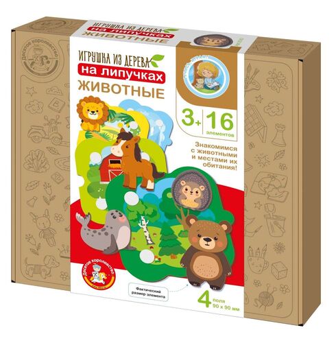 Игрушка "Игрушка из дерева на липучках "Животные" 16 эл". Стандарт: 14. Страна производитель: РОССИЯ. Производитель: Десятое Королевство.