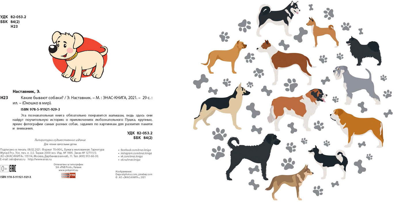 Какие бывают собаки? Наставник Э. Окошко в мир Был у мальчика Пети забавный щенок по кличке Пушок. Однажды щенок задумался: а как он может лучше всего послужить своему хозяину? И решил Пушок пойти к взрослым собакам – пусть расскажут, какая у них бывает служба и как они её несут. Эта познавательная книжка обязательно понравится малышам, ведь здесь они найдут поучительную историю о приключениях любознательного щенка, крупные, яркие фотографии самых разных собак, задания по картинкам для развития памяти и внимания. Для чтения взрослыми детям. Переплет...