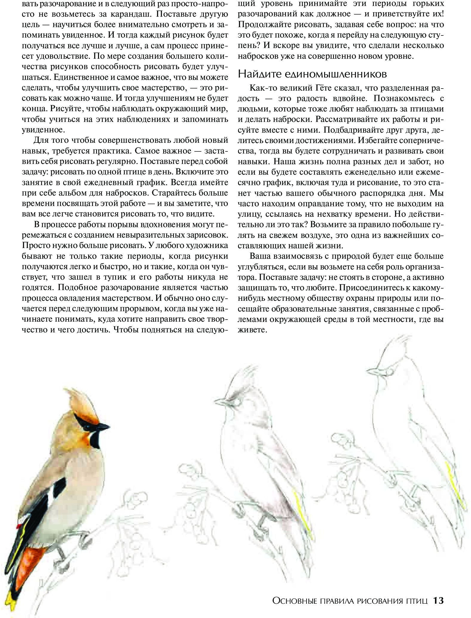 Откройте для себя всю красоту мира, научившись рисовать птиц!Книга Джона Лоуза - это поистине вдохновенное и окрыляющее произведение, как и его пернатые персонажи. Альбом касается изображения не только внешнего облика птиц, но и образа их жизни, повадок и движений. Здесь переплетаются техника рисунка и интереснейшие факты о живой природе, а живопись трактуется как один из способов познания мира. Как практическое руководство книга даст вам возможность повысить собственные навыки до уровня настоящего искусства и станет прекрасным ориентиром и для новичков, и для профессионалов. Разбирая вместе с читателем целую серию подробных упражнений, отточенных на реальных работах, автор дает необходимую тренировку как вашей зрительной памяти, так и руке. Вы не обманетесь в своих ожиданиях!Каждая птица, изображенная в книге, срисована с натуры.Научитесь:- видеть и схватывать пропорции любой птицы любого вида- сосредотачивать внимание на самом важном и сразу воплощать это в натурных набросках- изображать птиц в полете- правильно использовать акварель и цветные карандаши- избегать типичных ошибок и заблуждений при рисовании птиц.