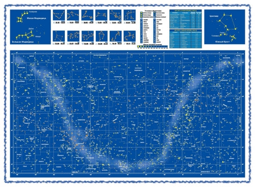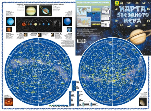уникальный вид двусторонней карты звёздного неба. Полноцветная, складная карта содержит полезную справочную информацию о планетах Солнечной системы, о включении звезд о созвездиях.