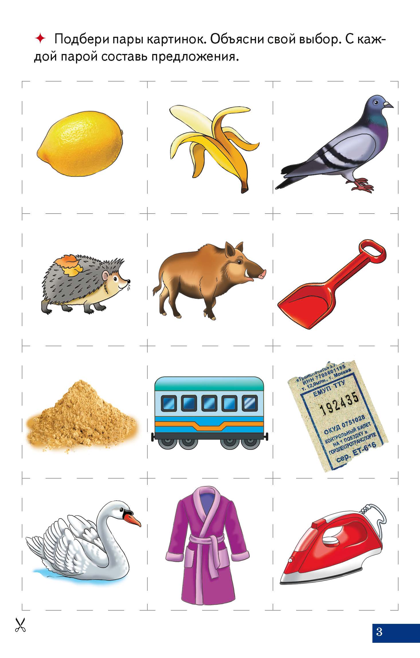 Пособие предназначено для детей, начинающих говорить. В карточках подобраны задания, насыщенные словами 4-й слоговой структуры (по А.К. Марковой) — это двусложные слова с закрытым слогом: палец, пакет, халат, салат, ежик, лебедь, петух, лимон, голубь, тюлень, диван, букет, билет, батон, банан, кабан, замок, утюг, вагон, паук, тукан, совок, песок, кубик. Для того чтобы ребенок запомнил слово, необходимо его повторить не один раз. Предлагаемые упражнения способствуют многократному произнесению этих слов для более прочного их запоминания. Вопросы сформулированы таким образом, чтобы малыш отвечал одним словом в именительном падеже. Например: «Кто едет в вагоне?» — «Петух»; «Что надела бабушка?» — «Халат». Задания на развитие внимания, памяти, восприятия сделают занятия по карточкам увлекательными и полезными. Выполняя даже неречевые задания, просите ребенка называть картинки. Например, при решении судоку просите ребенка называть картинки, которые он выкладывает в клеточки. В данном наборе вы найдете задания на понимание значения предлогов, на развитие логического мышления. Задания на проговаривание слова без визуальной опоры (задавая ребенку вопросы, переверните карточку) способствует развитию самостоятельной речи. Разрезав картинки из Приложения на с. 16-21, можно играть в «Чего не стало?», «Что изменилось?», «Парные картинки». Картинки можно прикреплять на доску, прятать в крупу или песок, грузить в машину, прикреплять на прищепки и т.д. Просите ребенка проговаривать слово, с которым совершается действие.