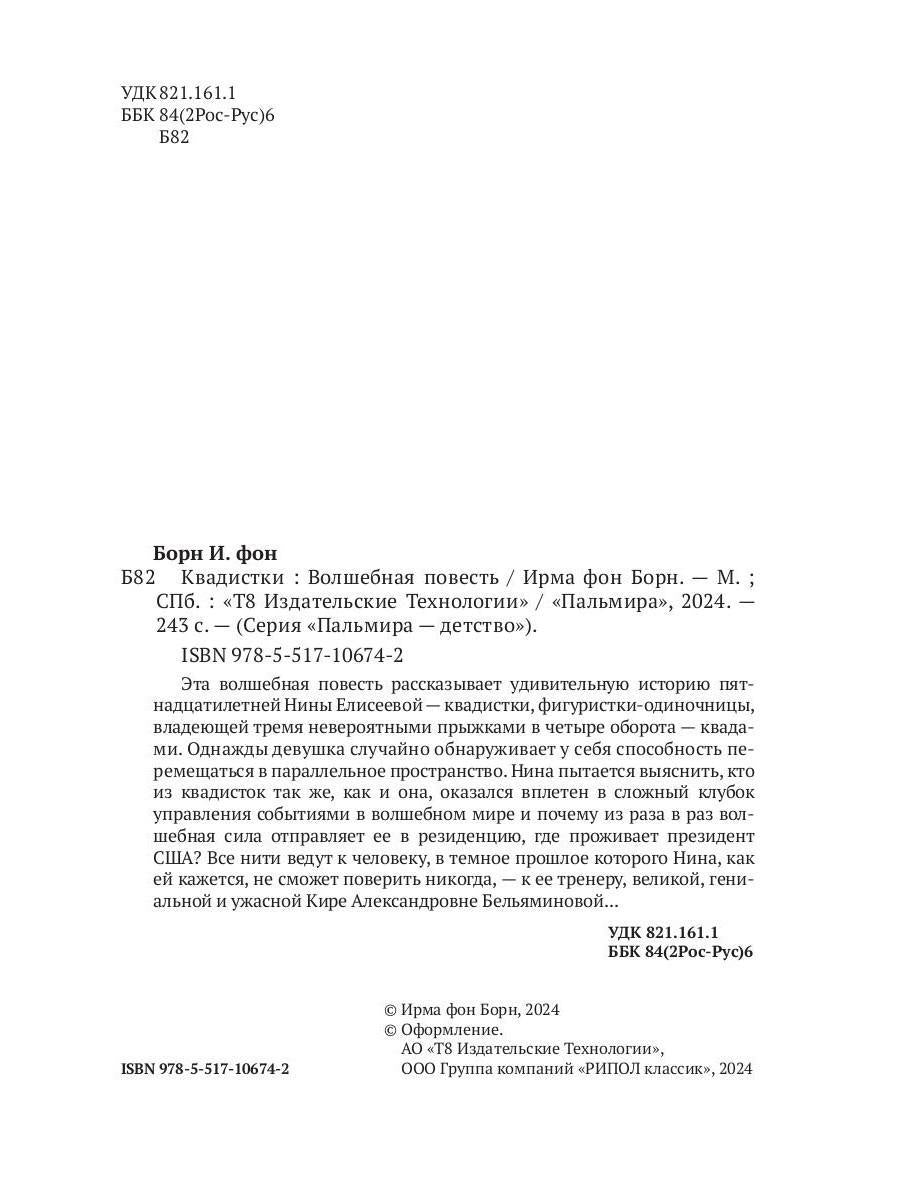 Handling time: 19 days Автор: фон Борн Ирина, «Квадистки: волшебная повесть»: Эта волшебная повесть рассказывает удивительную историю пятнадцатилетней Нины Елисеевой — квадистки, фигуристки-одиночницы, владеющей тремя невероятными прыжками в четыре оборота — квадами. Однажды девушка случайно обнаруживает у себя способность перемещаться в параллельное пространство. Нина пытается выяснить, кто из квадисток так же, как и она, оказался вплетен в сложный клубок управления событиями в волшебном мире и почему из раза в раз волшебная сила отправляет ее в резиденцию, где проживает президент США? Все нити ведут к человеку, в темное прошлое которого Нина, как ей кажется, не сможет поверить никогда, — к ее тренеру, великой, гениальной и ужасной Кире Александровне Бельяминовой...