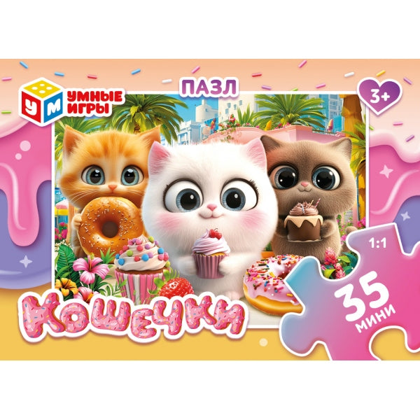 Котята с едой. Пазлы в коробке 35 деталей. 90х65х25 мм. Умные игры в уп.32шт в кор.8уп