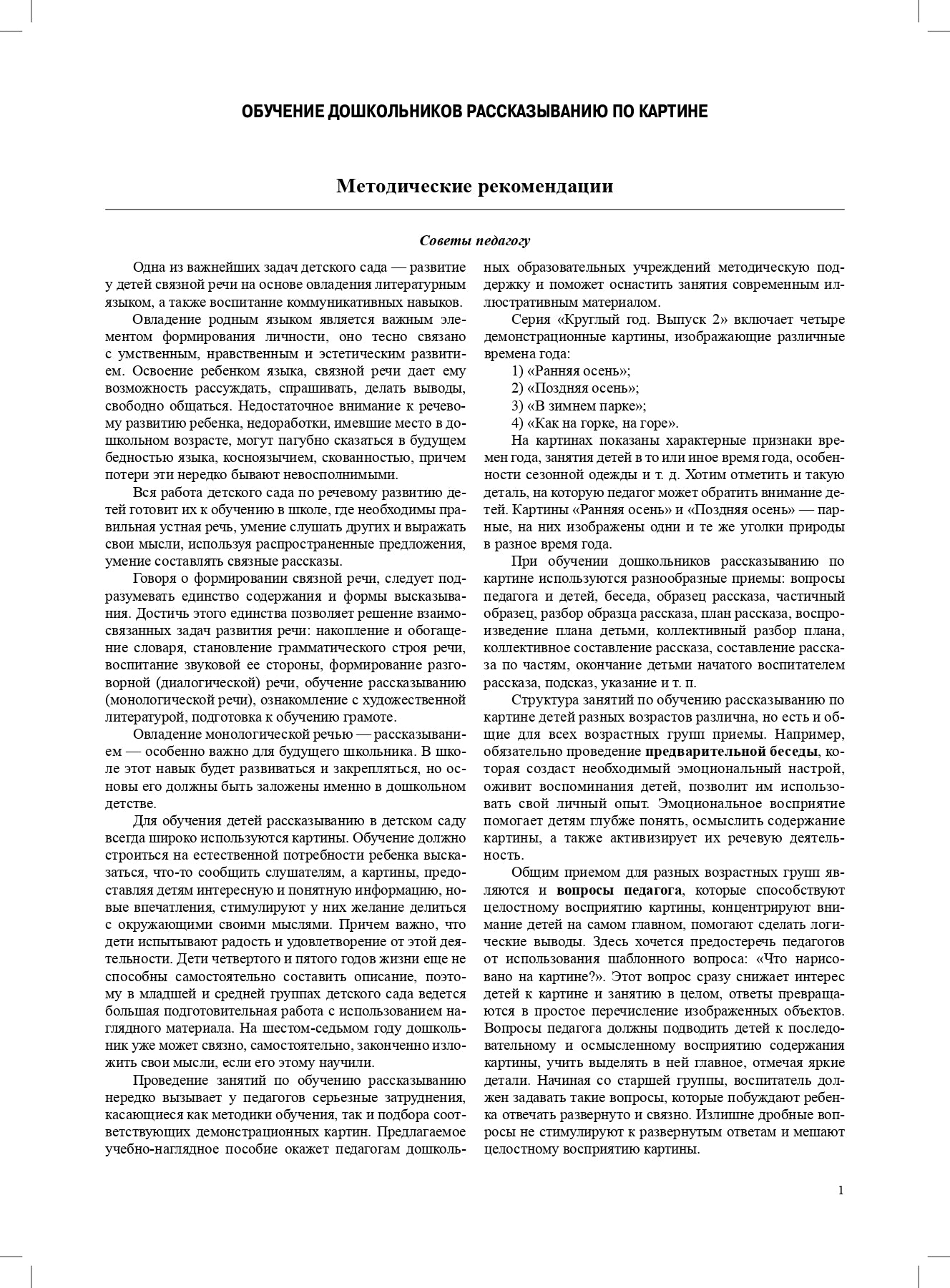 Handling time: 19 days В альбоме представлены четыре демонстрационные картины, изображающие различные времена года, а также методические рекомендации по обучению дошкольников разных возрастных групп рассказыванию по картине. Приведены примерные планы-конспекты занятий. В ходе занятий решаются не только задачи речевого развития (в частности, связной речи), но задачи развития неречевых психических функций (восприятия, внимания, памяти, мышления), творческого воображения; прививается любовь к природе. Для педагогов дошкольных образовательных учреждений общего и коррекционного вида.