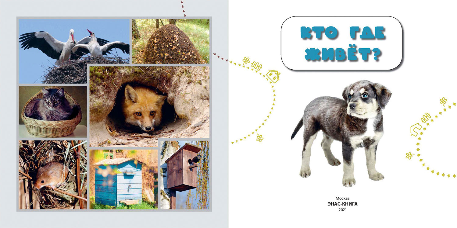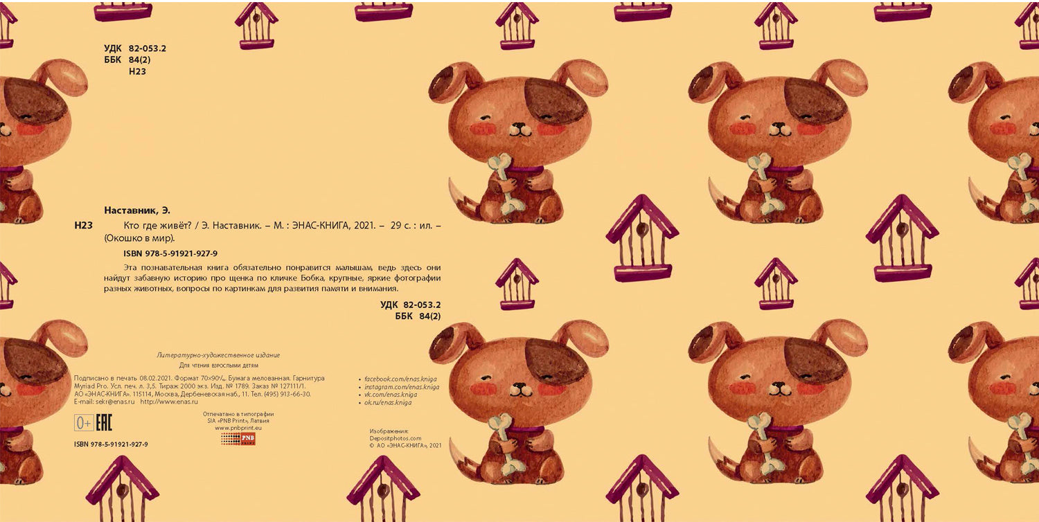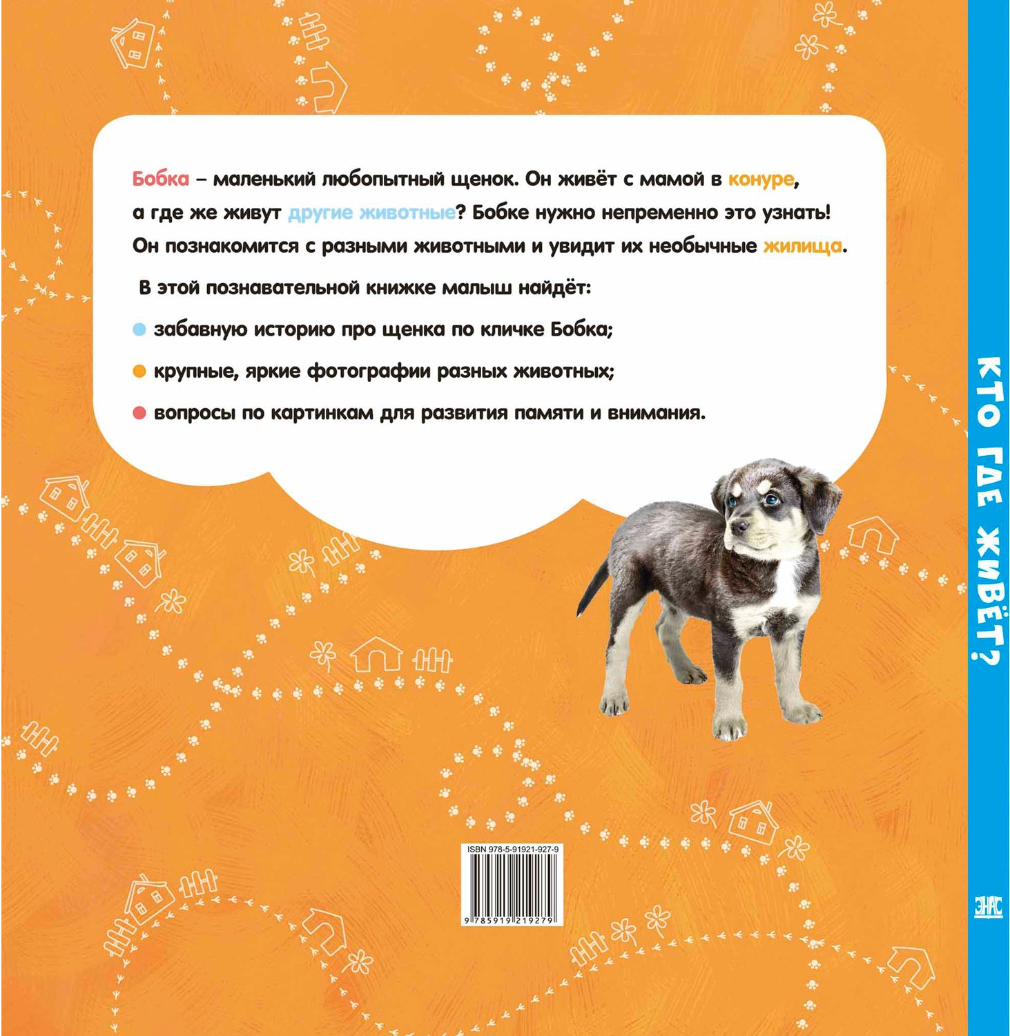 Кто где живёт? Наставник Э. Окошко в мир Маленький любопытный щенок живет с мамой к конуре. Решил он узнать, а где живут другие животные? И отправился щенок в путешествие… Эта познавательная книжка обязательно понравится малышам, ведь здесь они найдут забавную историю про щенка по кличке Бобка, крупные, яркие фотографии разных животных, вопросы по картинкам для развития памяти и внимания. Для чтения взрослыми детям. Переплет / 29 с. / Формат 215 × 215 мм