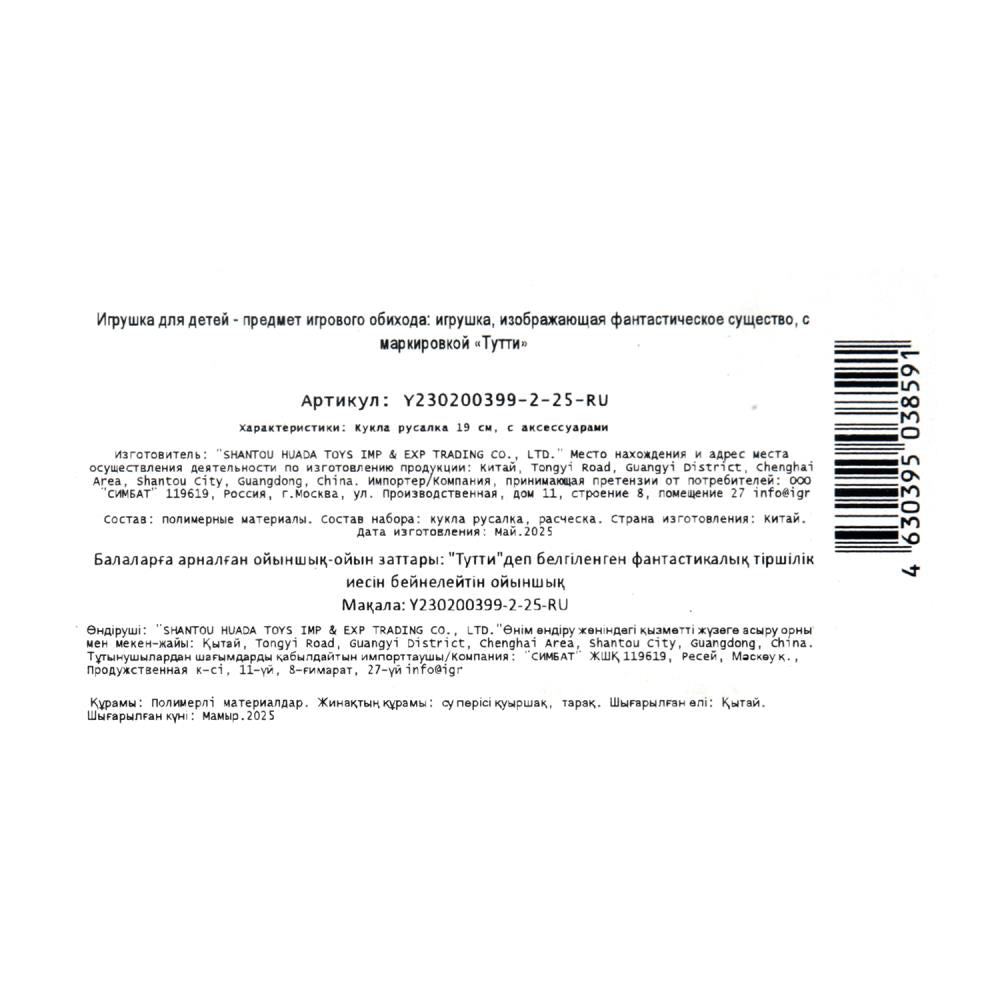 Игрушка "Кукла русалка 19 см, с крыльями, расческа, блист. Тутти в кор.2*180шт". Размер: 0,35.