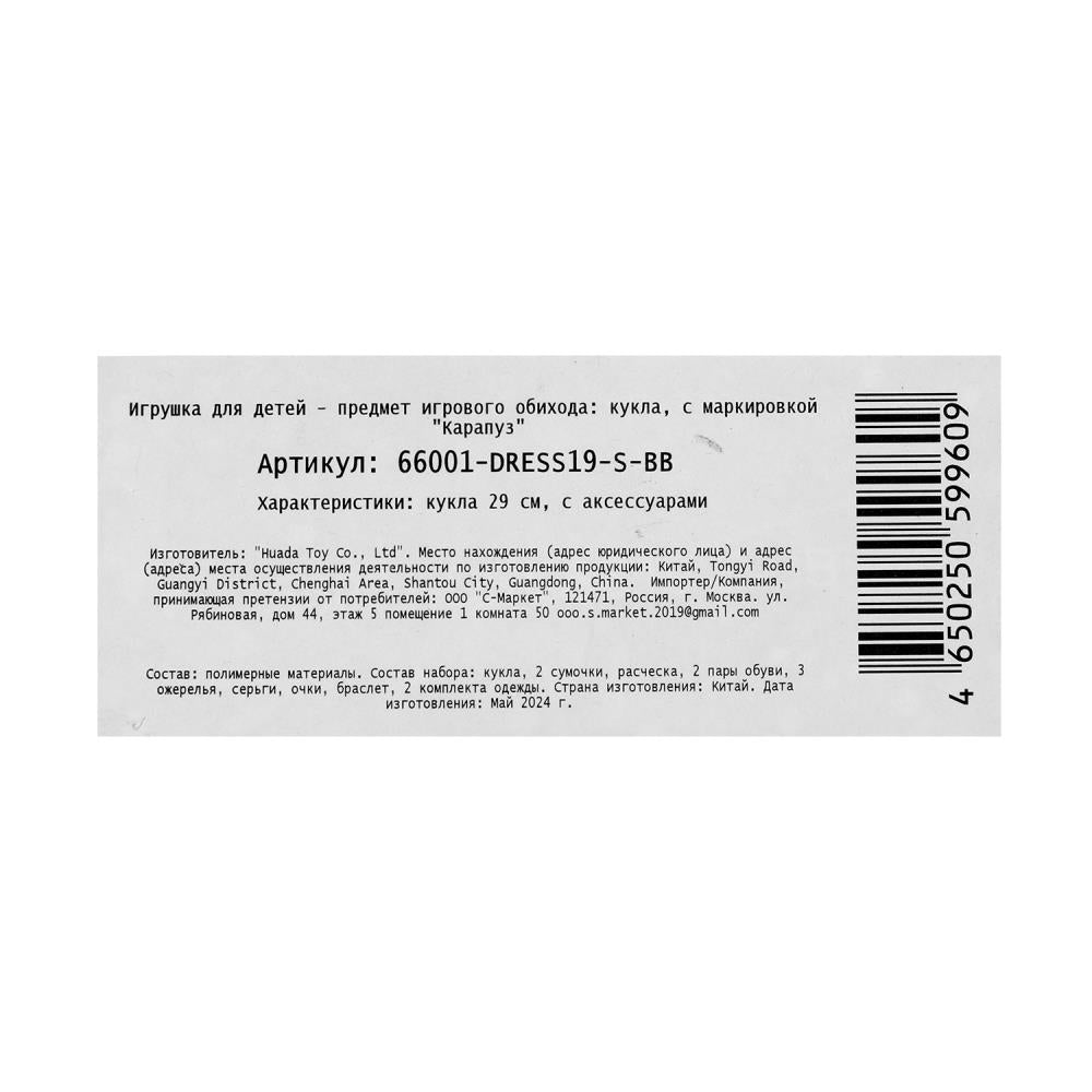 Игрушка "Кукла София 29 см, руки и ноги сгиб, 2 комплекта одежды, акс, кор КАРАПУЗ в кор.24шт". Размер: 0,124.