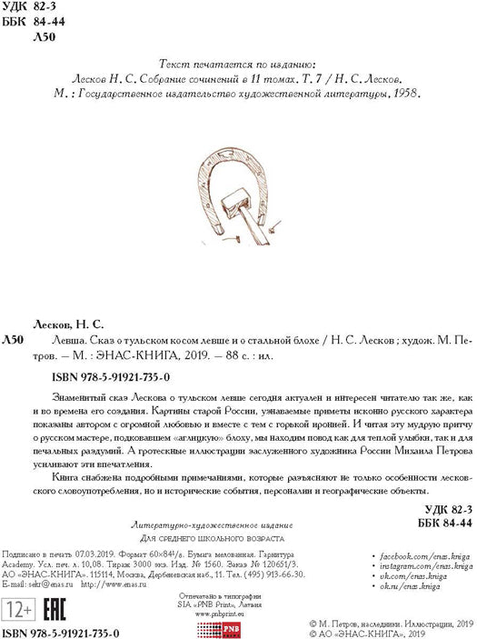 Handling time: 14 days Знаменитый сказ Лескова о тульском левше сегодня актуален и интересен читателю тпе же, как и во времена его создания. Картины старой Россииё, узнаваемыеё приметы исконно русского характера показаны автором с огромной любовью и вместе с тем с горькой иронией. И читая эту мудрую притчу о русском мастере, подковавшем "аглицкую" блоху, мы находим повод как для теплой улыбки, так и для печальныйх раздумий. А гротескные иллюстрации заслуженного художника России Михаила Петрова усиливают эти впечатления.Книга снабжена подробными примечаниями, которые разъясняют не только особенности лесковского словоупотребления, но и истроические события, персоналии и географические обьекты.