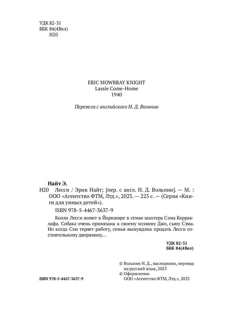 Handling time: 19 days Автор: Найт Эрик, «Лесси»: Эрик Найт (1897–1943) — англо-американский писатель. Роман «Лесси», изданный в 1940 году по мотивам опубликованного ранее рассказа «Лесси, вернись!», принес автору известность. Роман был переведён на 25 языков и неоднократно экранизирован.