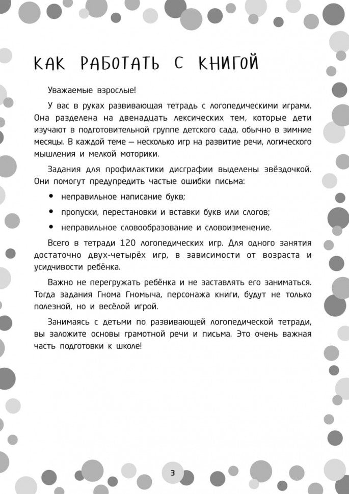 • 12 "зимних" лексических тем В тетради 120 логопедических игр на развитие речи, логического мышления и мелкой моторики. Задания для профилактики дисграфии выделены звездочкой: они помогут предупредить частые ошибки письма. Для одного занятия достаточно двух-четырёх игр. Занимаясь с ребенком по развивающей логопедической тетради, вы заложите основы грамотной речи и письма. Это очень важная часть подготовки к школе!