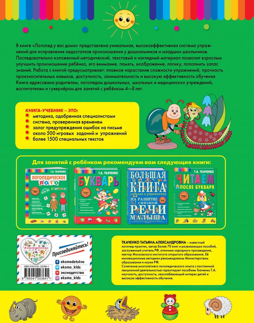 Правильное произношение необходимо ребенку для уверенного общения, успешного обучения, грамотного чтения и письма, гармоничного развития. В книге представлена высокоэффективная система из 500 упражнений, проверенная многолетней практикой. Она рассчитана на исправление недостатков произношения у детей 4-8 лет. Практическая часть книги охватывает все звуки речи, часто искажаемые детьми. Пользоваться этой книгой смогут не только логопеды, но и родители, и воспитатели.Татьяна Ткаченко—заслуженный учитель России, логопед, она написала уже более полусотни книг и учебно-методических пособий для дошкольников.