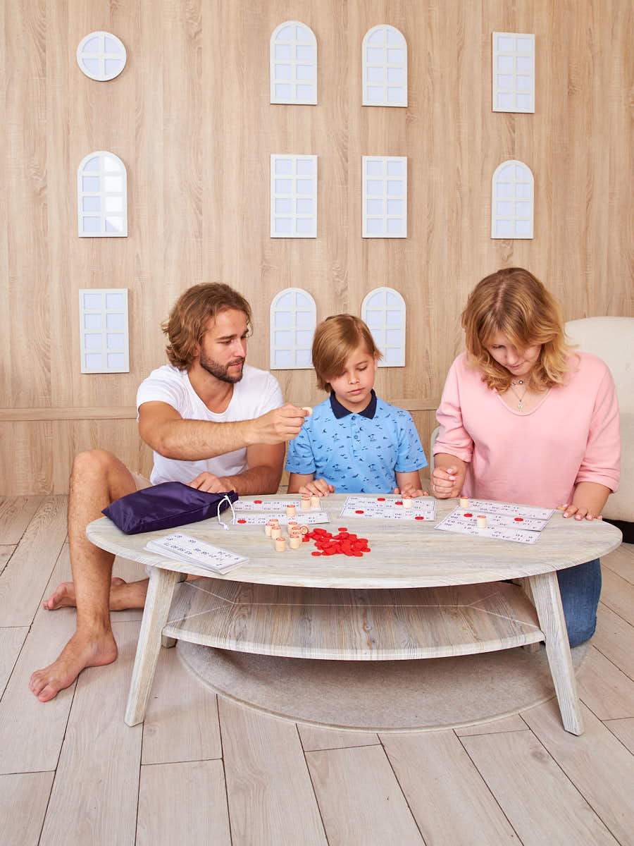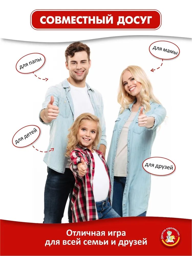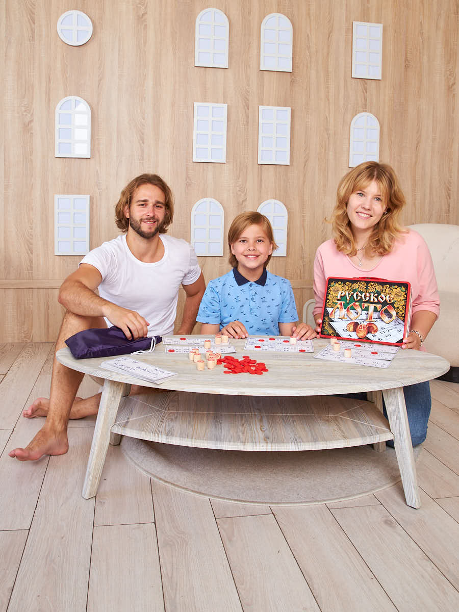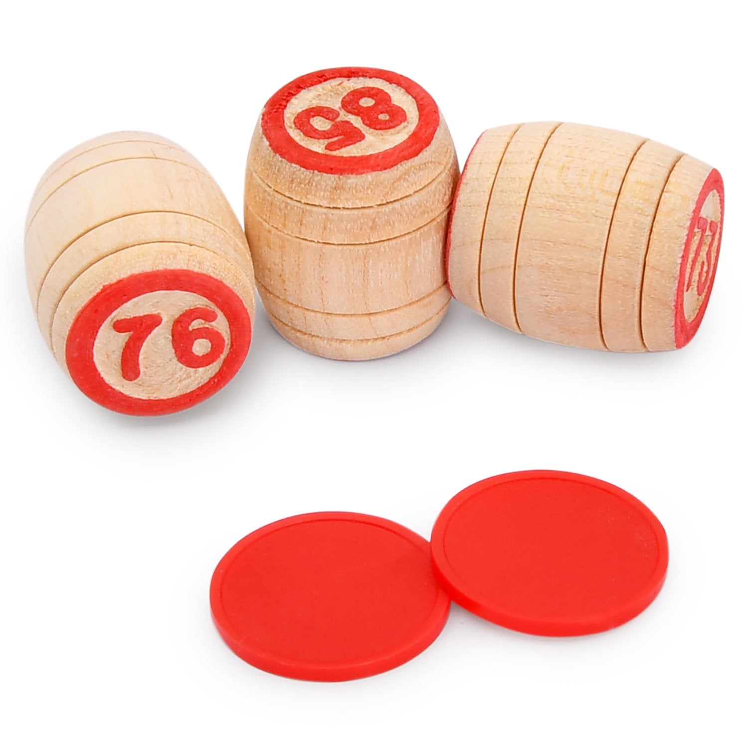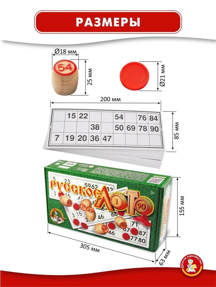 Традиционная российская игра, о существовании которой знает каждый. Благодаря простым правилам и азарту эта игра завоевала огромную популярность и заняла место в одном ряду с такими развлечениями для большой весёлой компании, как домино и карты. КАРТОЧКИ И БОЧОНКИВ игре использовалось 90 бочонков. На каждом бочонок с двух сторон нанесен свой номер. Все бочонки кладутся в специальный непрозрачный мешок и перед началом игры тщательно перемешиваются в нем. Игровая карточка состоит из трех строк, в каждой из которых по 9 ячеек, 5 из них составляют числа. Пустые клетки для игры не показаны.ПОДГОТОВКА К ИГРЕ Существует 2 стороны игры. Первый, короткий, заключается в том, что выигрывает игрок, который первым закроет маркерами все 5 чисел одной любой строки на игровой карте. Во втором варианте игры выигрывает тот, кто первым закроет полностью все маркеры на одной своей карте. Перед началом игры вы становится ведущим, который либо принимает участие в игре наравне с другими игроками, либо только ведет игру. После этого каждый из игроков берет себе одну или несколько карт, причём количество игровых карт у каждого из игроков должно быть одинаковым. О числе таких карт игроков договариваются перед началом игры. Маркеры игроков делят поровну. Затем каждый игрок раскладывает перед собой пустые игровые карты и маркеры. ХОД ИГРЫВедущий, не глядя, достает из мешка один бочонок и громко и отчетливо произносит вслух его номер, а затем откладывает бочонок в сторону. Таким образом, с каждым объявленным числом в мешке становится на 1 бочонок меньше. После этого у каждого игрока наконец есть такое число на его игровых карточках. При этом игрок должен помнить, что если у него несколько карточек, то на них могут появиться одинаковые числа. Если ведущее число на игровой карте есть, игрок закрывает его (или их) маркером. Если такого числа нет, то игрок ждёт объявление следующего числа.Бочонки достаются до тех пор, пока один из игроков не выиграет на оговоренных перед игрой условиях.Игра будет идти весело, если участники будут использовать старинный жаргон игроков в лото:1 - "кол", 3 - "трое", "на троих", 10 - "бычий глаз", 11 - "барабанные палочки", 12 - "дюжина", 13 - "чертова дюжина", 18 - "в первый раз", 22 - "утята", 25 - "опять 25", 44 - "стульчики", 50 - "полета", 55 - "перчатки", 66- "валенки", 69- "туда сюда", 77- "топорики", 88- "бабушка", 89 - "дедушкин сосед", 90 - "дедушка".КОНЕЦ ИГРЫПосле того как один из игроков выигрывает,игра заканчивается.Желаем удачи!Игра из дерева, картона и пластмассы.Для детей старше 3 лет.Состав:бочонки - 90 шт.мешок - 1 шт.карточки - 24 шт.жетоны - 100 шт.инструкция - 1 шт.Упаковка: картонная коробка.Сделано в России.