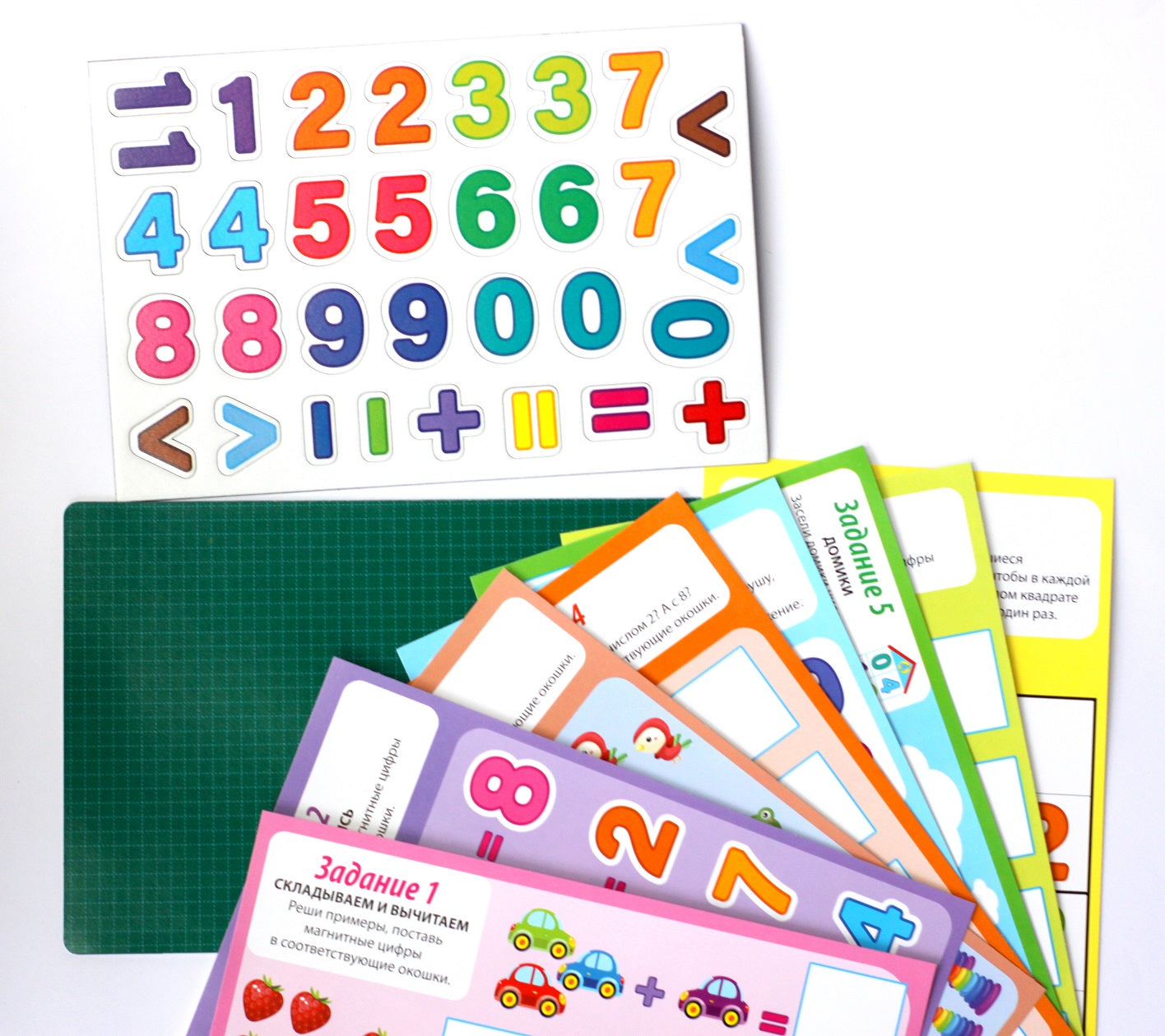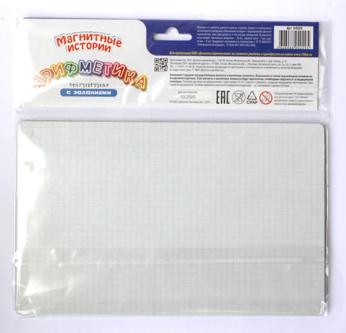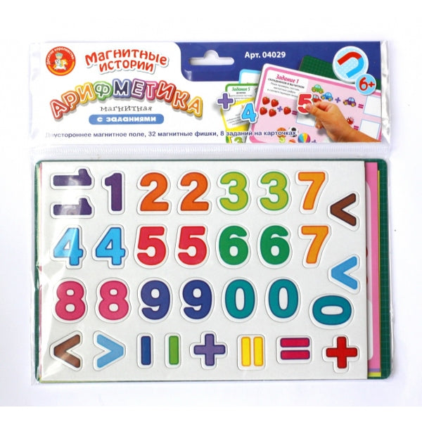 Магнитная обучающая игра «Арифметика с заданиями» для детей от 6 лет. Европодвес. Состав игры: двухстороннее магнитное игровое поле (23,5 х 14,7 см), карточки с заданиями – 8 шт. (22,5 х 13,7 см), магнитные цифры и знаки – 32 шт. (высота – 3 см). Материалы: магнит, магнитомягкое железо, картон. Задания, входящие в комплект, направлены на изучение различных математических операций: учимся складывать и вычитывать, сравнивать значения, решать числовые задачи.