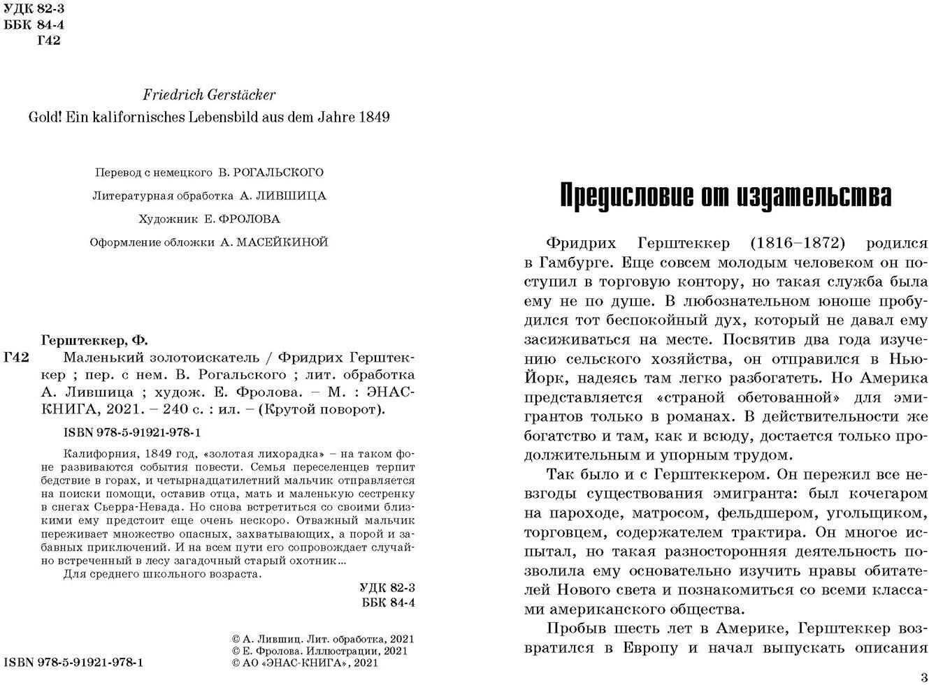 Калифорния, 1849 год, «золотая лихорадка» – на таком фоне развиваются события повести. Семья переселенцев терпит бедствие в горах, и четырнадцатилетний мальчик отправляется на поиски помощи, оставив отца, мать и маленькую сестренку в снегах Сьерра-Невада. Но снова встретиться со своими близкими ему предстоит еще очень нескоро. Отважный мальчик переживает множество опасных, захватывающих, а порой и забавных приключений. И на всем пути его сопровождает случайно встреченный в лесу загадочный старый охотник…Фридрих Герштеккер (1816–1872) – немецкий путешественник и писатель. Написанная для юношества повесть «Маленький золотоискатель» переведена почти на все европейские языки и до сих пор пользуется неизменной популярностью.Как автор «Маленького золотоискателя», Герштеккер может быть поставлен в один ряд с такими знаменитыми писателями, как Майн Рид, Фенимор Купер и Густав Эмар.Для среднего и старшего школьного возраста.