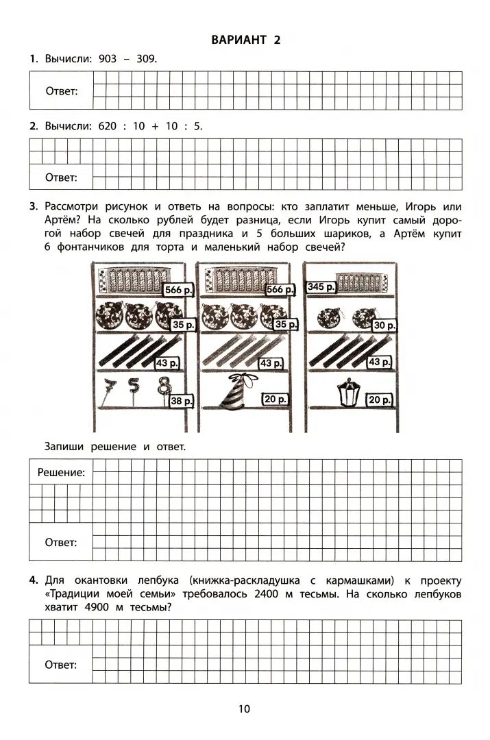 Учебное пособие предназначено для учащихся четвероклассников с целью их подготовки к Всероссийской проверочной работе. Данный вариант пособия соответствует требованиям ФГОС НОО, последовательному и типам заданий демоверсии ВПР. Издание имеет 10 вариантов для выполнения обучающихся. Формат каждого задания отдельного пособия разработан в соответствии с типичными заданиями Образец проверочной работы по математике (4 класс) 2022 года.Пособие адресовано для работы обучающимся в 4-х классах, а также учителям и родителям.