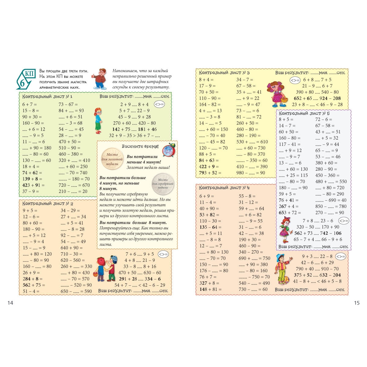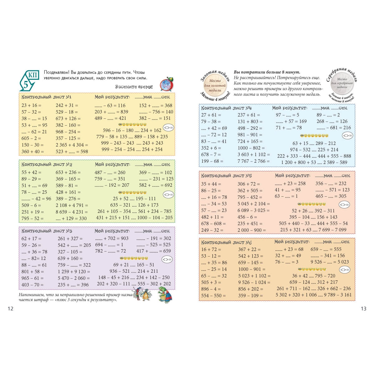 "Устный счет - гимнастика для ума". Сделать его интересным не так просто. Пособие "Математический марафон. Сложение и вычитание" поможет вам в этом. А еще и отследит "сложные моменты" для ребенка и поможет с ними справиться.В "Тетради личных достижений" собраны и структурированы по сложности математические примеры. Пройдя все девять КП (контрольных пунктов) и получив медали, вы сможете с уверенностью сказать: ребенок прошел свой Личный математический марафон.Тренажер предназначен для учеников 2-4 классов. Задание на каждом развороте направлено на отработку определенного типа примеров устного счета - от счета в пределах 10 до сложения и вычитания четырехзначных чисел.Рекомендуется к использованию вместе с книгой "Квест-тренажер УСТНЫЙ СЧЕТ. Сложение и вычитание", а также с другими тетрадями для коллективных квестов.