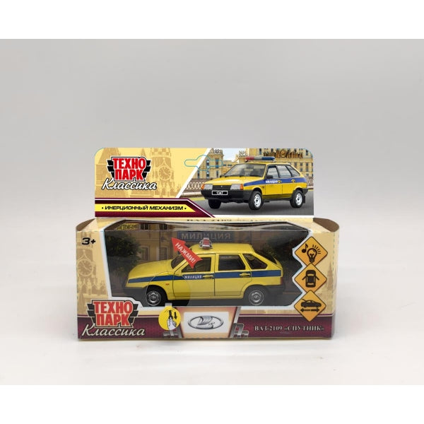 Машина металл свет-звук ваз-2109 "спутник"12см,дв,баг,инер,МИЛИЦИЯ желт,кор. Технопарк в кор.2*36шт