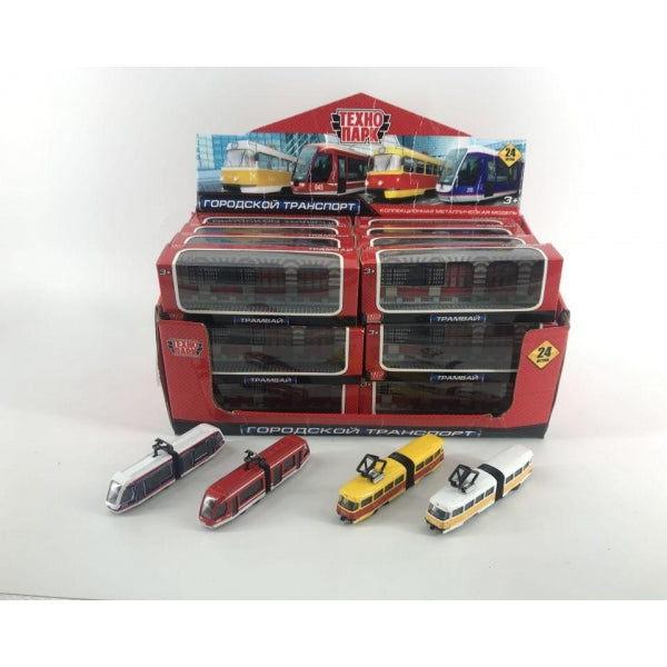 Машина металл ТРАМВАЙ С РЕЗИНКОЙ длина 12 см, в ассорт, дисплей, кор. Технопарк уп-24шт в кор.2*3уп