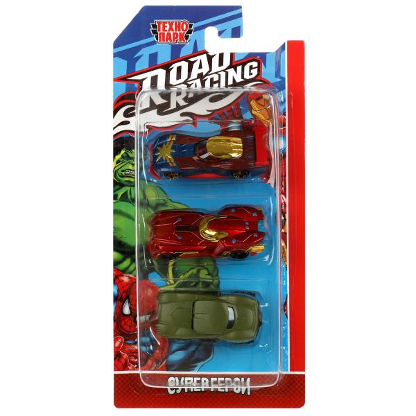 Машина металл ROAD RACING набор супергерои 7,5 см, 3 шт,в ассорт, блистер Технопарк в кор.2*120наб