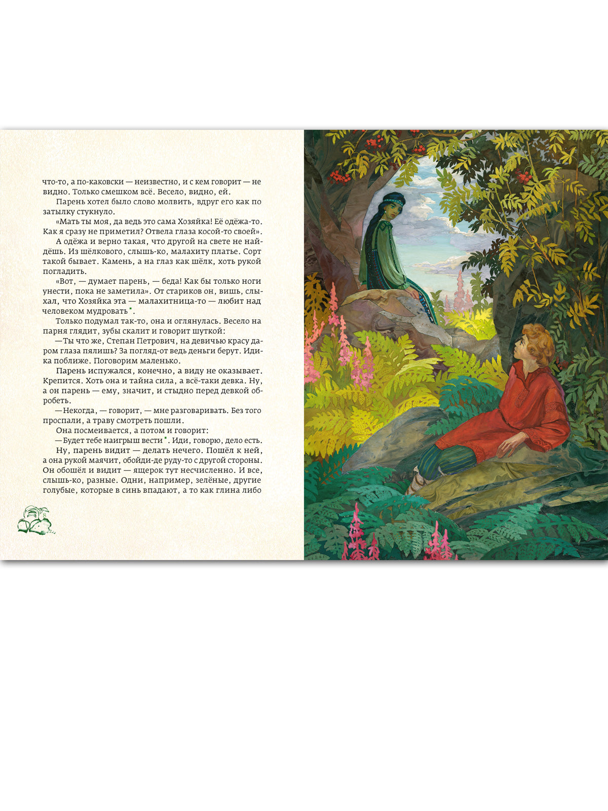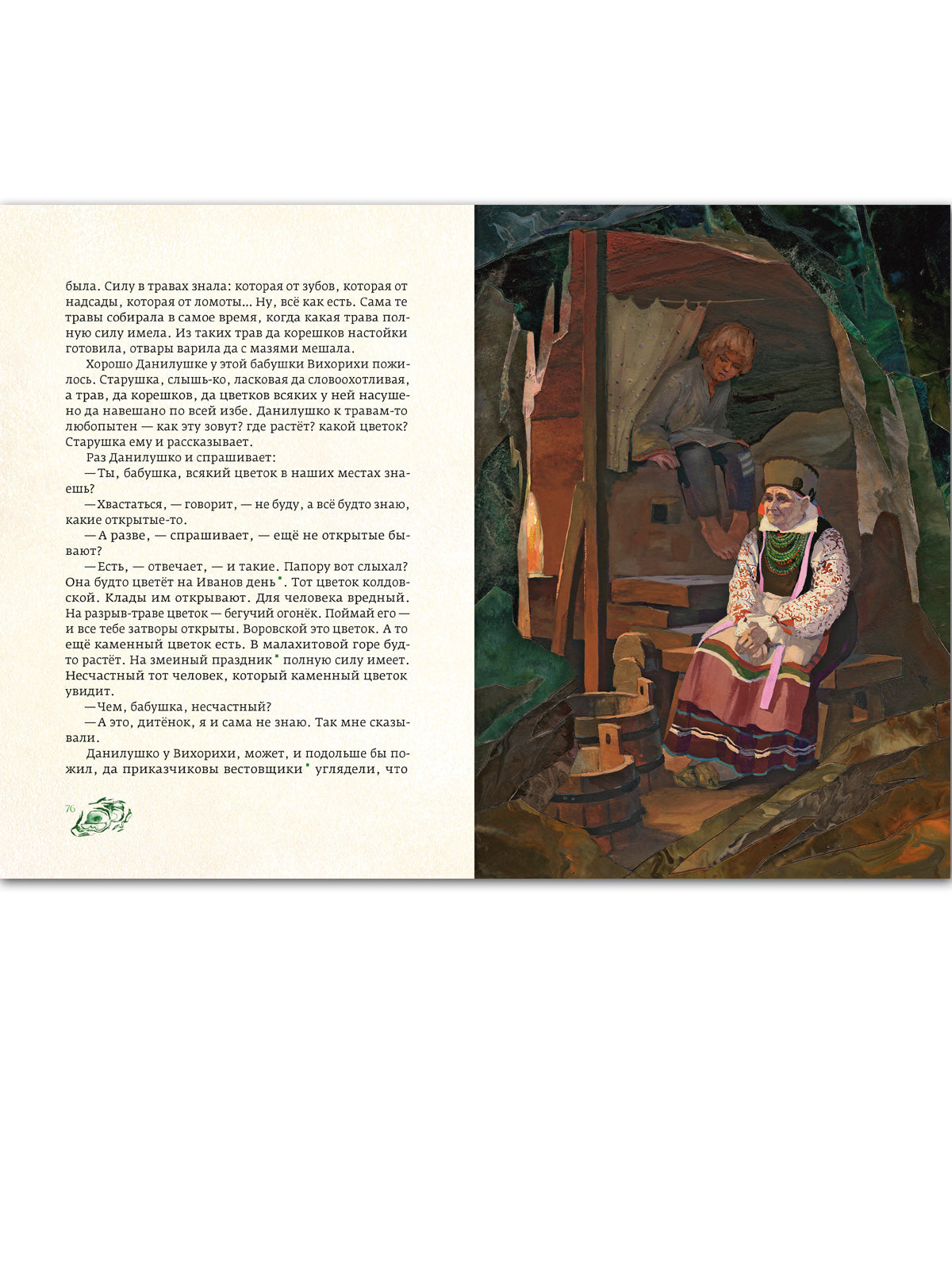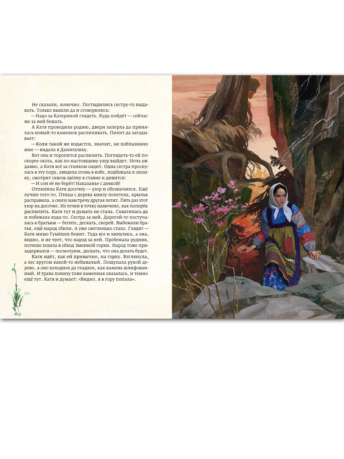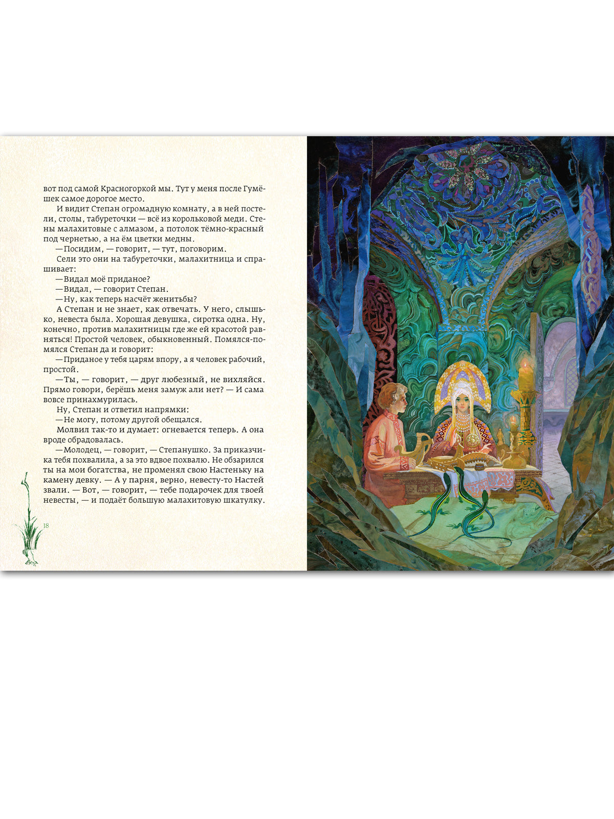 А в горе «как комнаты большие… а стены у них разные. То всё зелёные, то жёлтые с золотыми крапинками. На которых опять цветы медные. Синие тоже есть, лазоревые. Однем словом, изукрашено, что и сказать нельзя». Вот эту красоту уральской земли, невероятное богатство уральских гор с любовью и глубоким знанием природы камня передал художник Вячеслав Назарук, несколько лет посвятивший иллюстрированию самых известных сказов Павла Бажова.