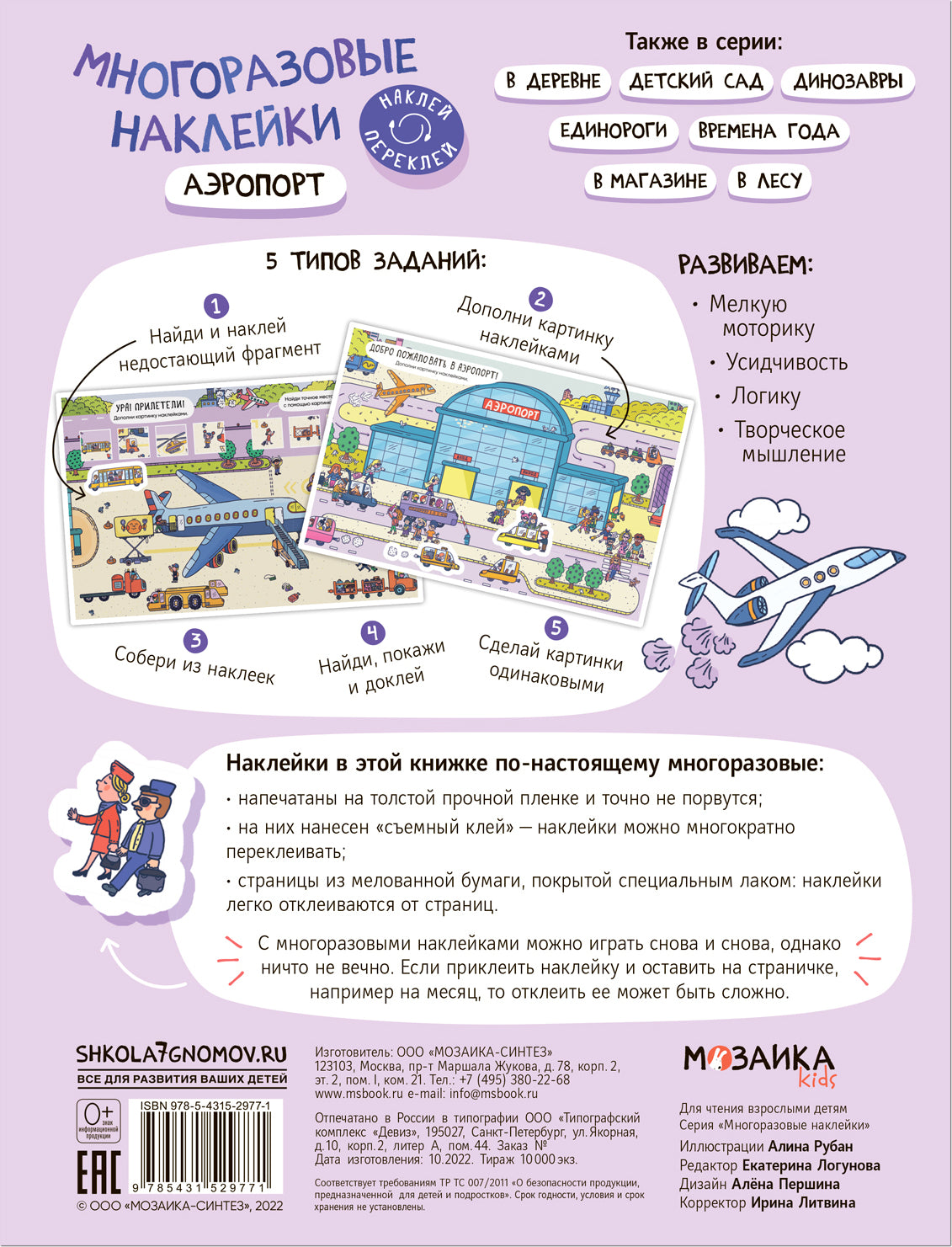 Handling time: 19 days Аннотация к книге "Аэропорт":Книга «Аэропорт» из серии «Многоразовые наклейки» познакомит малыша с работой настоящего аэропорта. Ребенок узнает о его устройстве и даже заглянет в кабину пилотов. В книге ребенка ждут 5 типов интересных и понятных заданий, которые он сможет выполнять самостоятельно. Такие задания помогут в развитии логики, внимательности, творческого мышления, мелкой моторики.Благодаря специальной технологии наклейки можно переклеивать снова и снова. Малышу понравится играть с многоразовыми наклейками: приклеивать и отклеивать, исправляя ошибки и создавая новые композиции. Читать дальше…