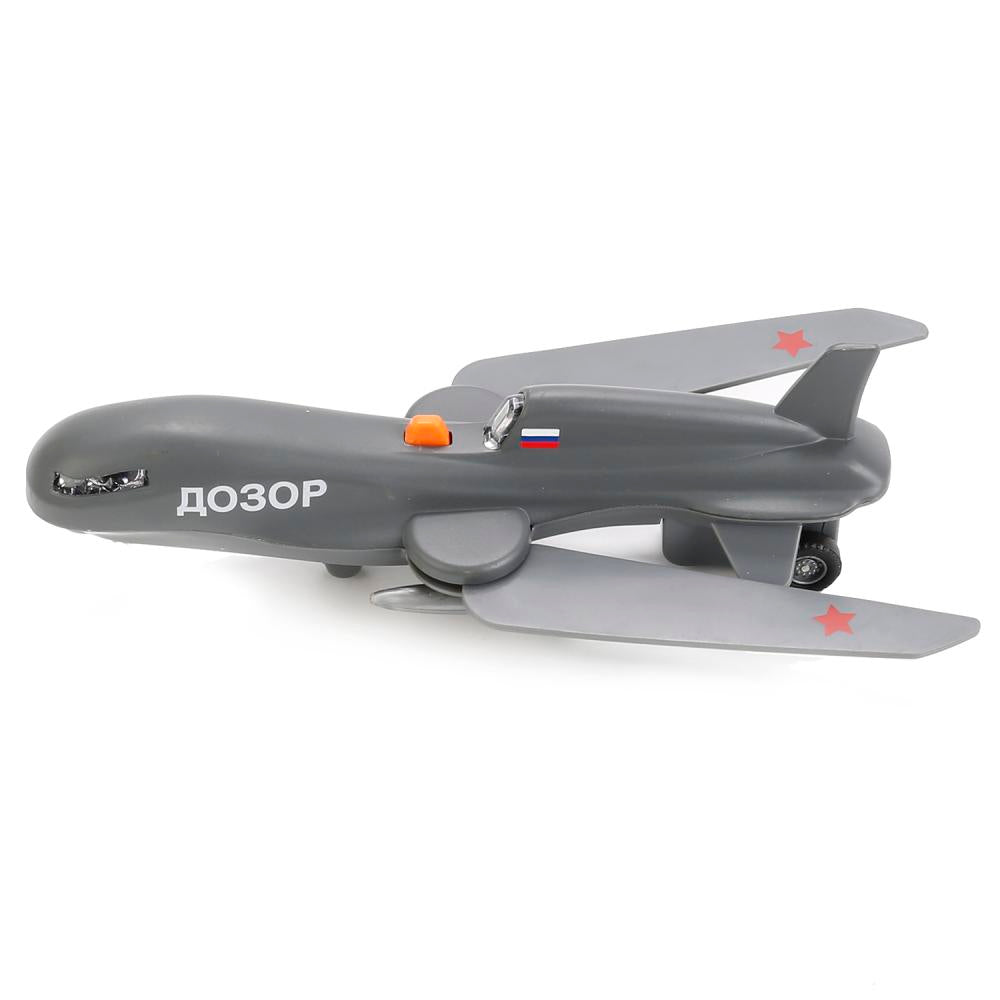 Handling time: 14 days Металлическая модель беспилотника Дозор порадует юного любителя военной техники и украсит его коллекцию. Дизайн беспилотника проработан детально, световые и звуковые элементы добавляют ему реалистичности. Модель обладает инерционным механизмом и складными крыльями. Размер 19 см. Рекомендовано детям старше 3-х лет. Работает от батарейках типа LR 44 (AG 13) (входят в комплект).