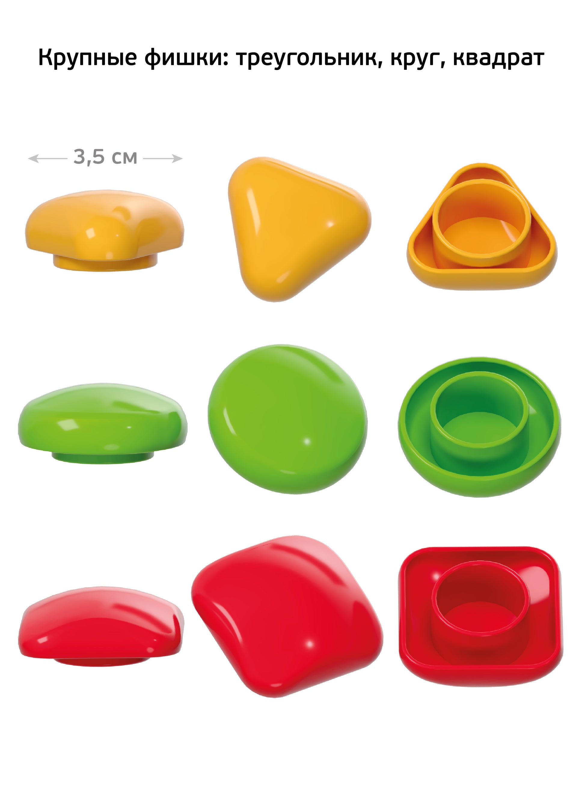Набор состоит из полей-основ, красочных карточек и разноцветных пластиковых деталей в виде квадратов, кругов и треугольников. Задача ребенка - установить на игровое поле карточку и подобрать для нее элементы нужных форм и цветов. Два пластиковых глазика в комплекте «оживят» картинку и сделают игру еще более интересной.