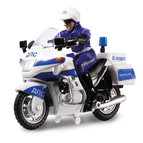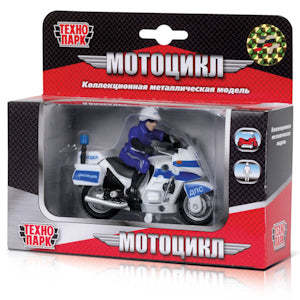 МОТОЦИКЛ "ТЕХНОПАРК" МЕТАЛЛ. ИНЕРЦ. ДПС ПОЛИЦИЯ, С ПОЛИЦЕЙСКИМ В РУСС. КОР. в кор.2*24шт Игрушка выполнена в виде мотоцикла «ДПС» с фигуркой в форме полицейского, шлеме и очках. Все элементы коллекционной модели детально проработаны, что добавляет её реалистичности. Мотоцикл выполнен в сине-белом цвете с надписями «ДПС», «8 отдел», «Милиция» что делает её ещё более правдоподобной. Мотоцикл снабжен инерционным механизмом, что позволяет придавать ему ускорение несколькими прокатами. У мотоцикла функциональные колёса и благодаря встроенному инерционному механизму он реалистично ускоряется, стоит его лишь слегка оттянуть назад и отпустить. Тематические игры с интересными сюжетами разбудят воображение ребёнка, а манипуляции с игрушкой. Масштабные модели отличаются качественными ударопрочными материалами, продлевающими долговечность изделия тщательным исполнением со вниманием ко всем деталям, и имеют требуемые сертификаты соответствия для детских игрушек. Сделан из прочного высококачественного металла с элементами пластика. Рекомендовано детям от 3-х лет.