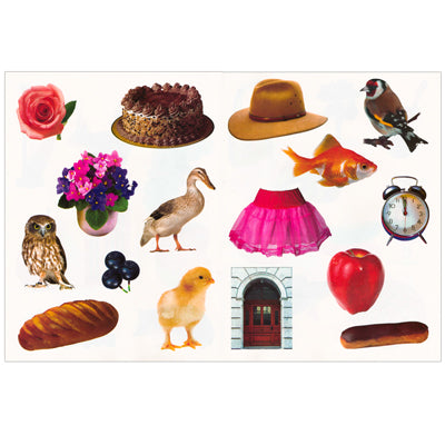 На каждую букву отведена отдельная страница с красочными фотографиями и подписями к ним. При этом одной картинки не хватает, ребенку предстоит найти ее среди наклеек и приклеить на нужное место.