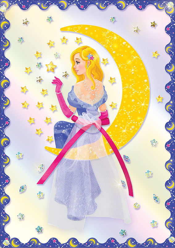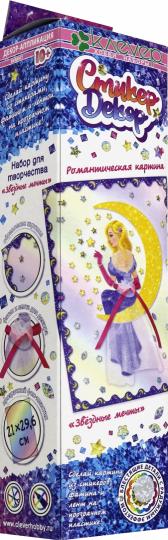 Набор "Звёздные мечты" серии "Романтические картины" предлагает подростку старше 10 лет создать оригинальную картину из стикеров на прозрачном пластике, декорируя изображение гармонично сочетающимся с рисунком невесомым фатином и атласной лентой. Нежный сюжет - девушка в бальном платье на месяце среди сверкающих звёзд - передаёт романтическую атмосферу мечтательности и эффект невесомости. Изысканность сюжета сочетается с лёгкостью исполнения: по схеме наклеить на прозрачный пластик красочные детали-самоклейки и голографические стикеры, собрать на проволоку фатин и закрепить его на картине, завязать бант из ленты.