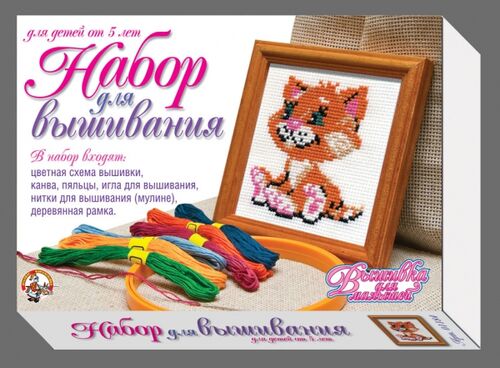 В набор для вышивания крестиком с пяльцами, иглой и рамкой «Котенок» входят:1. Цветная схема вышивки.2. Канва (размер 24,5х24,5 см).3. Пяльцы.4. Игла для вышивания.5. Нитки для вышивания (мулине).6. Деревянная рамка 17х17 см.Набор для вышивания рекомендован детям старше 5 лет.