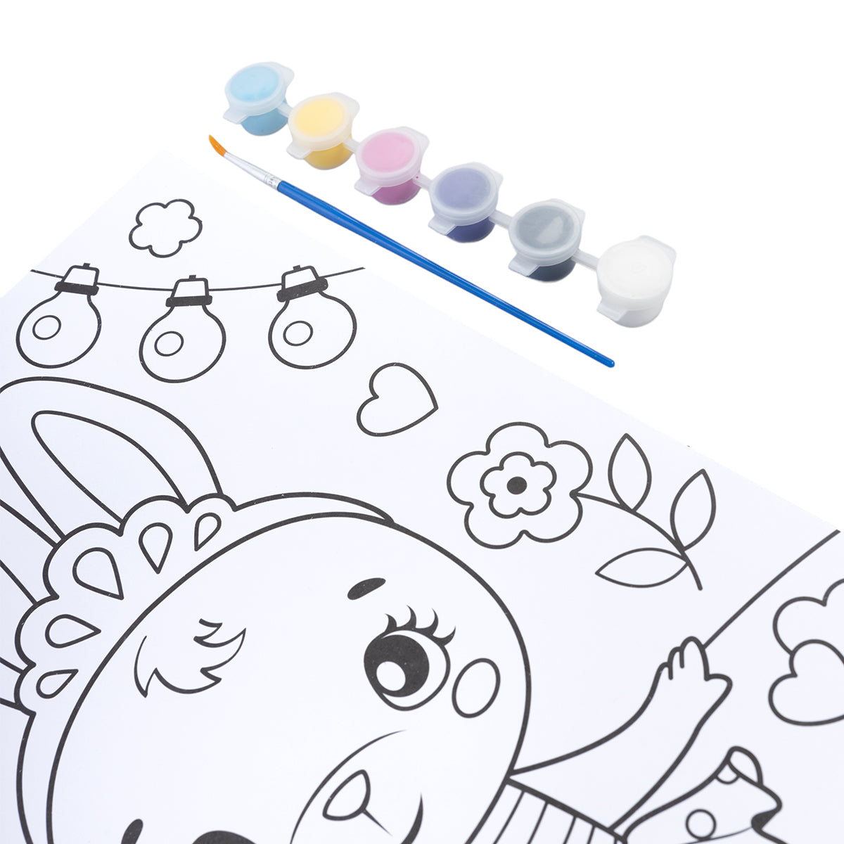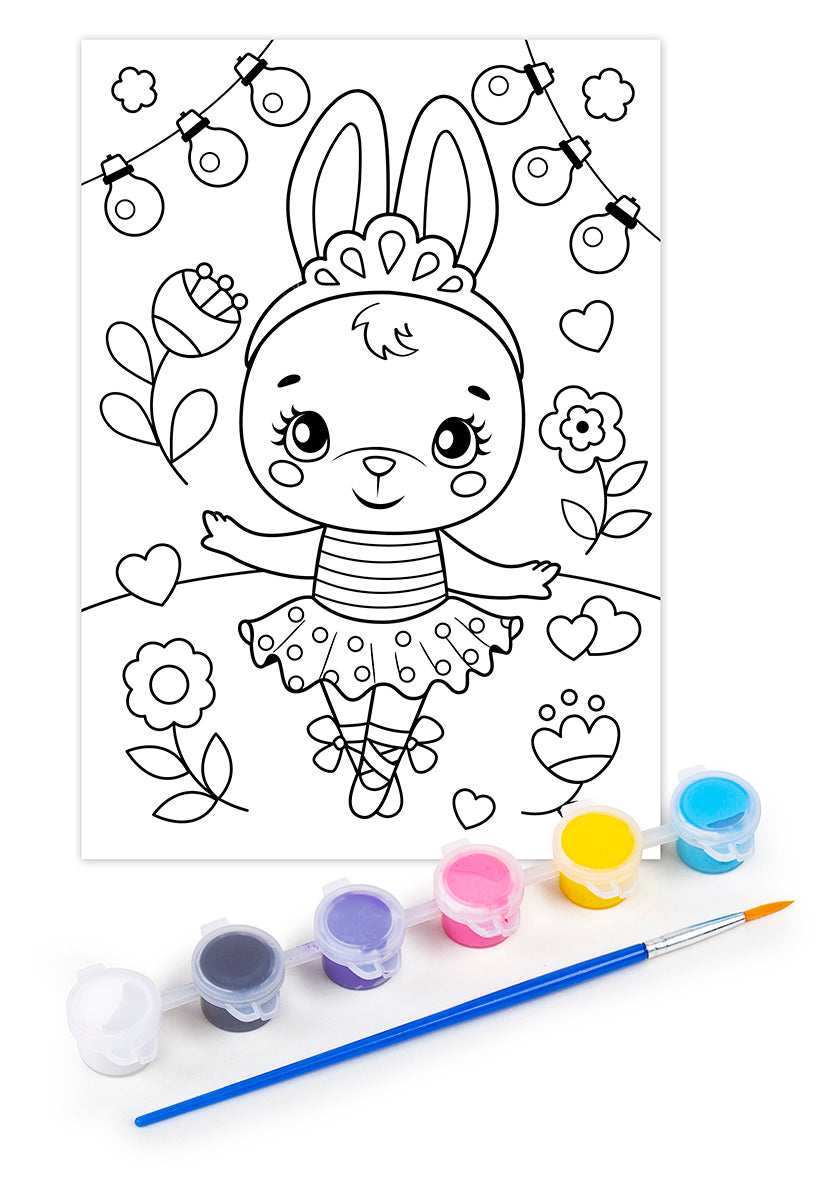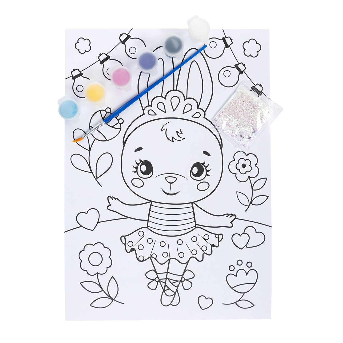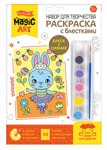 Набор для творчества. Раскраска с блестками "Заинька". В наборе: основа из плотной бумаги с нанесенным рисунком - 1 шт. (формат А4), краски акриловые - 6 шт., кисть - 1 шт., пакетик с блестками - 1 шт. Материалы: картон, полимерный материал, акриловые краски, кисть. Набор предназначен для детей старше 3 лет.