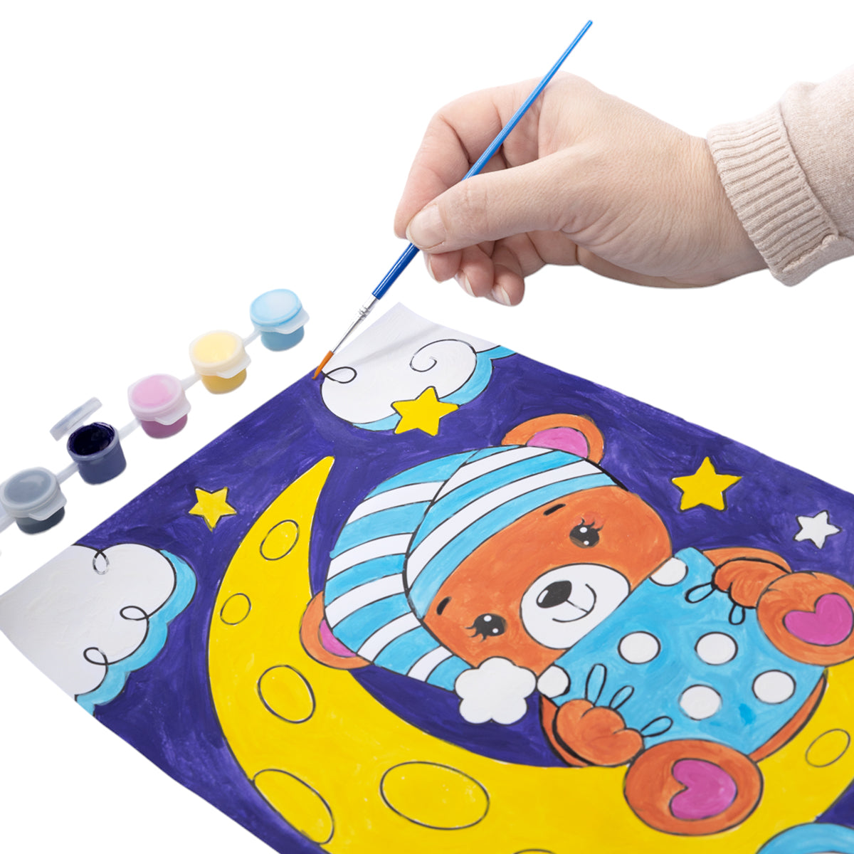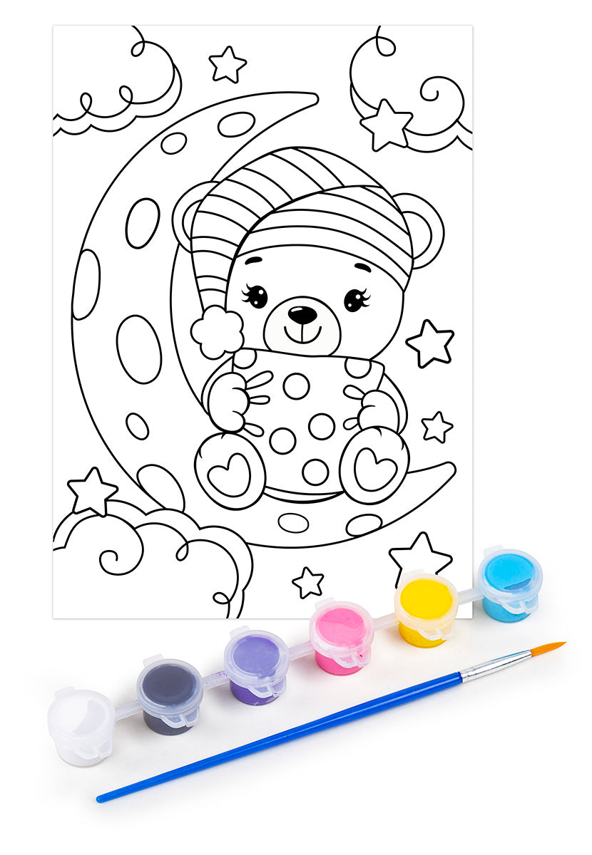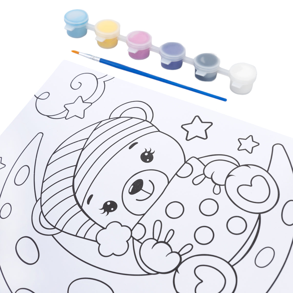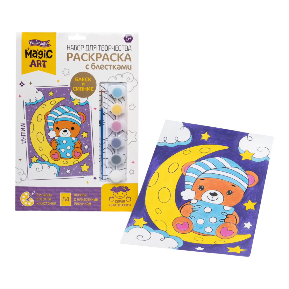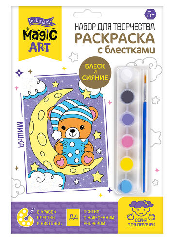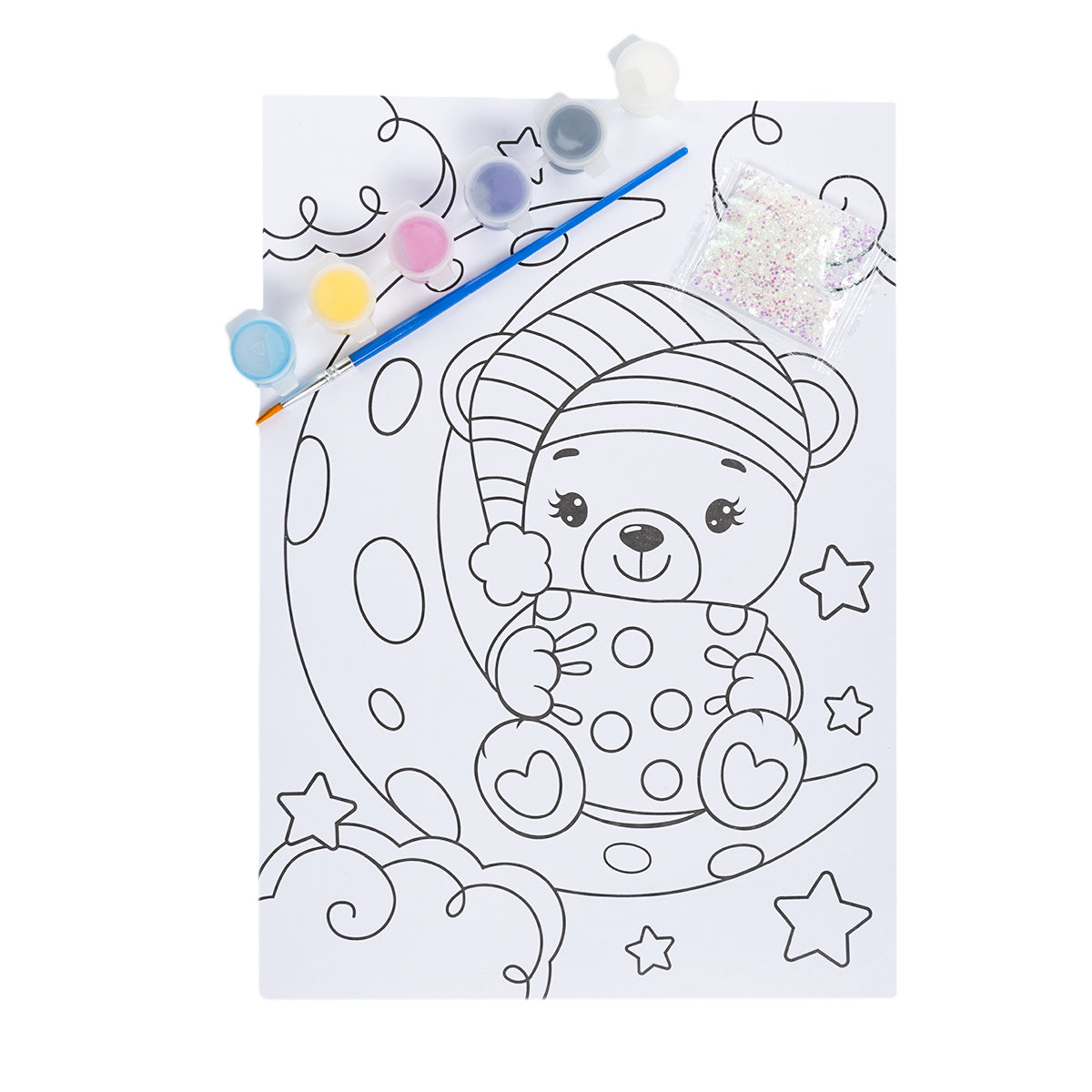 Набор для творчества. Раскраска с блестками "Мишка". В наборе: основа из плотной бумаги с нанесенным рисунком - 1 шт. (формат А4), краски акриловые - 6 шт., кисть - 1 шт., пакетик с блестками - 1 шт. Материалы: картон, полимерный материал, акриловые краски, кисть. Набор предназначен для детей старше 3 лет.