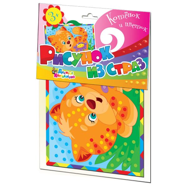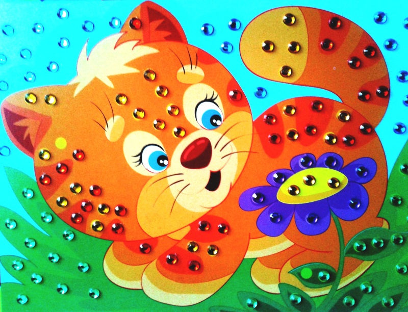 Картинки со стразами своими рукамиКаждый малыш, особенно девочка, любит котят. Без разницы, обнаруживают они, нарисованные или плюшевые. В предлагаемой нами развивающей игре ребенок может с большой любовью украсить нарисованного симпатичного котенка, который играет с цветком. Как раскрасить картинку стразами? Очень просто. В набор «Котенок и цветок» артикул 01647 входит 182 самоклеющиеся стразы. Они находятся на предварительной основе. А на рисунке оттенком цвета выделены места, где эти стразы в конечном итоге должны оказаться. Надо просто отклеить стразу от блока и приклеить ее в нужное место на картинке. Дети обычно быстро соображают куда, какого цвета блестку надо клеить.Полученный в итоге блестящий результат, украсит интерьер любой комнаты, будь то детская или игровая, а Ваш ребенок будет гордиться произведением.Картинка со стразами «Котенок и цветок», как и остальные игры этой серии, развивают у детей творческие способности, усидчивость, внимание и мелкую моторику рук. Обращаем ваше внимание на то, что стразы достаточно мелкие, чуть больше половины сантиметра в диаметре, при этом они яркие и блестящие, их легко можно держать во рту. В связи с этим мы настаиваем на контроле со стороны роста в процессе. К слову, рисунок со стразами «Котенок и цветок», как и другие рисунки этой серии, рациональнее всего купить у нас в интернет-магазине производителя «Десятое королевство». Пользуйтесь первоисточником.