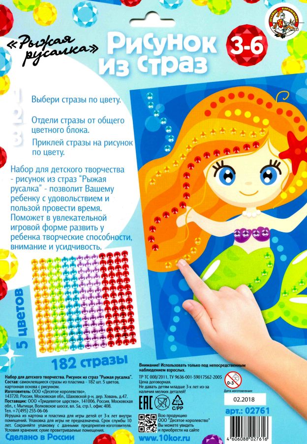 Набор для детского творчества мини-рисунок из страза «Рыжая русалка» позволит нашему ребенку с удовольствием и пользой провести время. Игра предпочтительна для детей от 3 до 6 лет.Состав детской мини-рисунки из страз «Рыжая русалка»:- картонная основа с рисунком размером 25х18 см - 1 шт;- самоклеящиеся стразы из пластика (диаметр 5 мм, 5 цветов) - 182 шт.Задача - раскрасить рисунок стразами. Для того, чтобы наклеить стразы на картинку, необходимо отделить стразы нужного цвета от блока и наклеить его на картинку, плотно прижав, к точкам, оранжевого цвета.