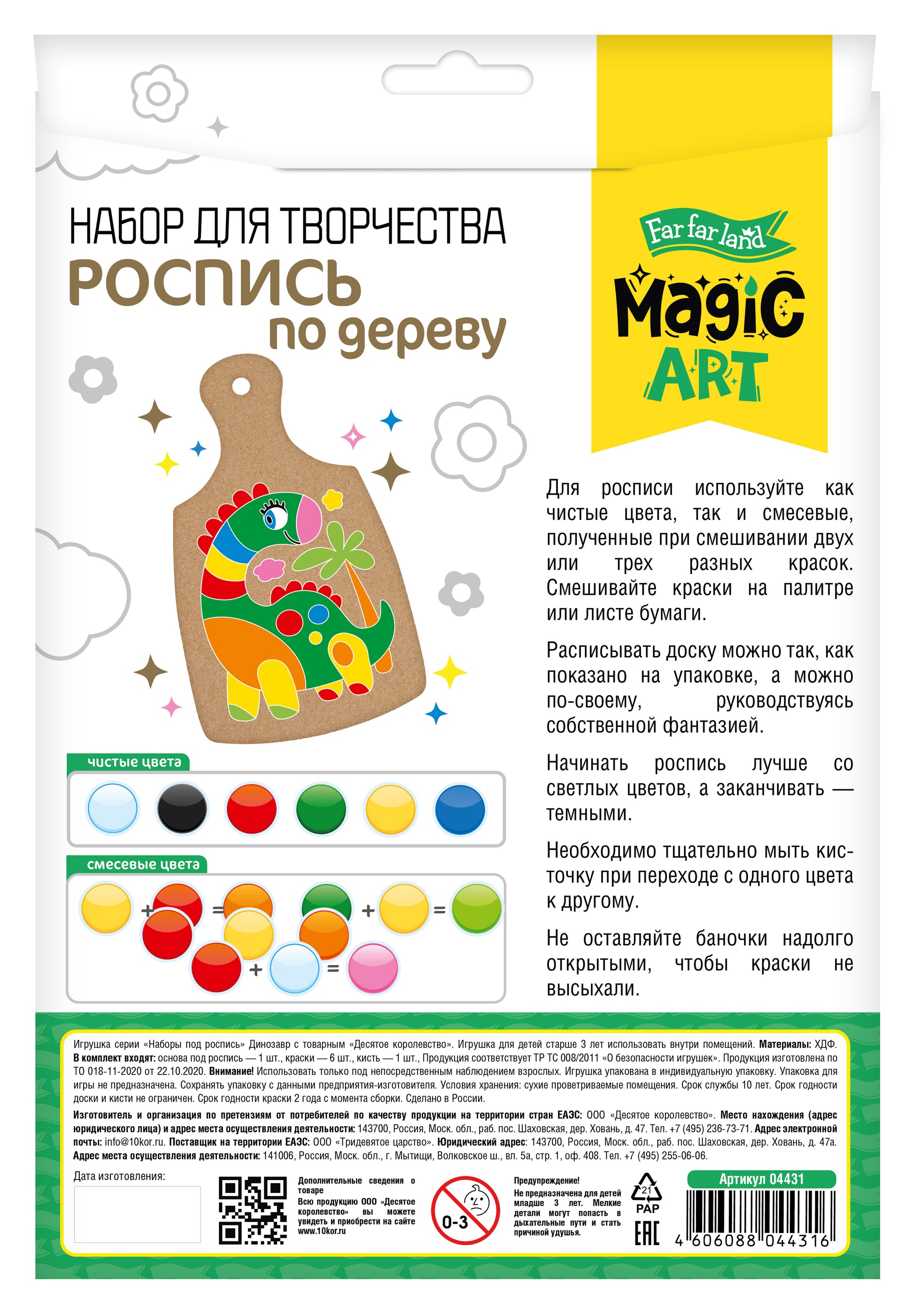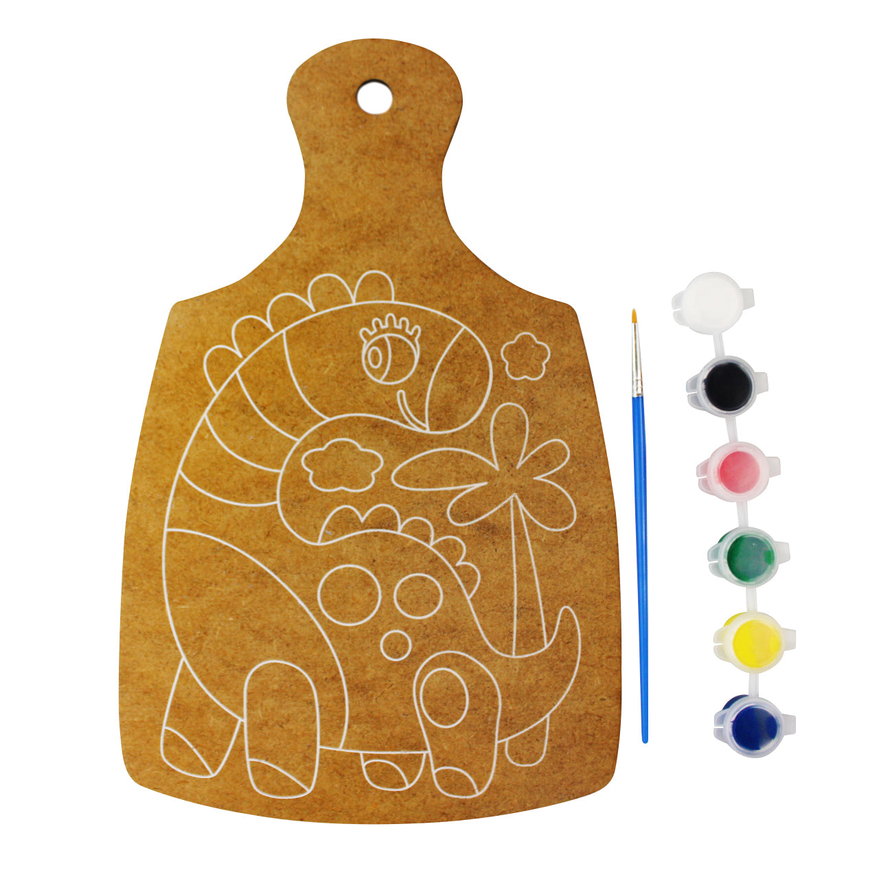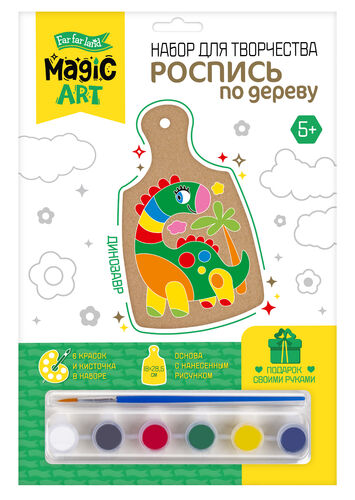 Роспись по дереву «Динозавр»Украсьте интерьер оригинальной декоративной разделочной доской! Проявите фантазию и образное мышление, и у Вас получится отличный подарок для Ваших близких! В наборе есть всё необходимое для создания шедевра своими руками.Состав набора: основа под роспись (доска из фанеры) – 1 шт. (29 х 18 см)краски (белого, чёрного, красного, зелёного, желтого и синего цветов) -- 6 шт.кисточка – 1 шт.Набор предназначен для детей от 5 лет.