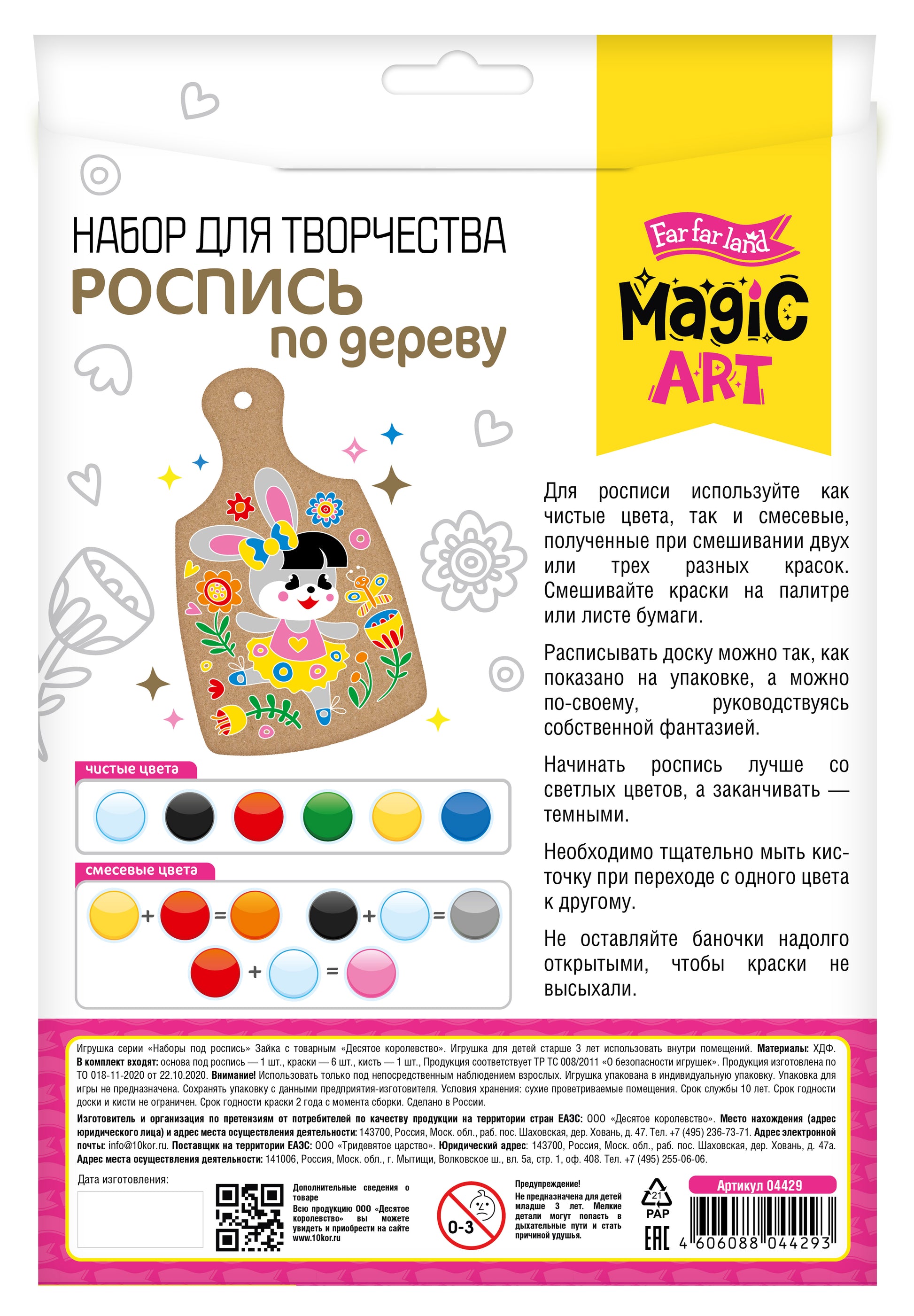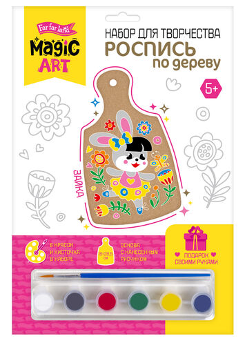 Украсьте интерьер оригинальной декоративной разделочной доской! Проявите фантазию и образное мышление, и у Вас получится отличный подарок для Ваших близких! В наборе есть всё необходимое для создания шедевра своими руками.Состав набора: основа под роспись (доска из фанеры) – 1 шт. (29 х 18 см)краски (белого, чёрного, красного, зелёного, желтого и синего цветов) -- 6 шт.кисточка – 1 шт.Набор предназначен для детей от 5 лет.