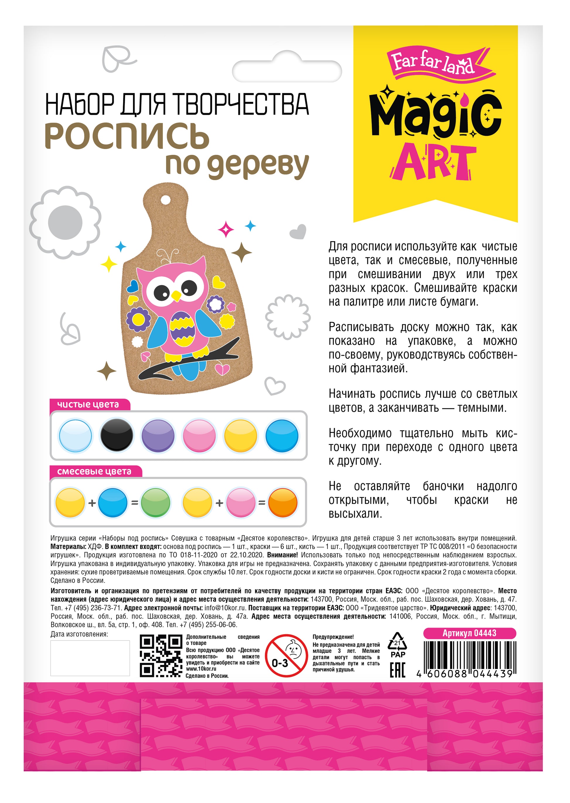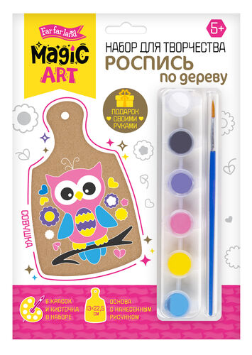 Роспись по дереву «Совушка» Состав набора: Основа под роспись (доска из хдф) – 1 шт. (22,5 х 13 см) краски (белого, чёрного, фиолетового, розового, желтого и голубого цветов) — 6 шт. кисточка – 1 шт.Набор предназначен для детей от 5 лет.