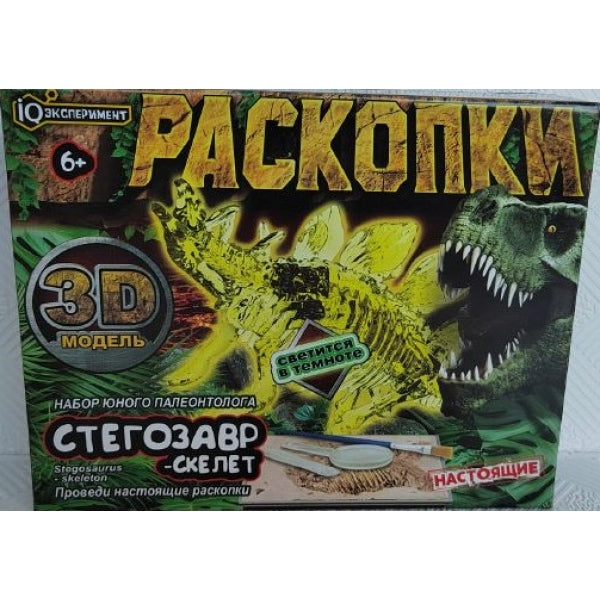 Набор раскопок скелета динозавра стегозавра, светится в темноте, кор. IQ Эксперимент в кор.2*24шт