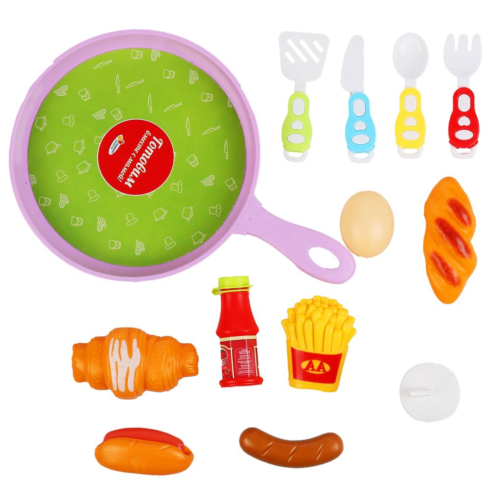 - 13 предметов: сковорода, нож, ложка, вилка, лопаточка, стаканчик с трубочкой, хот-дог, 2 круассана, картофель фри, кетчуп, яйцо, сосиска
